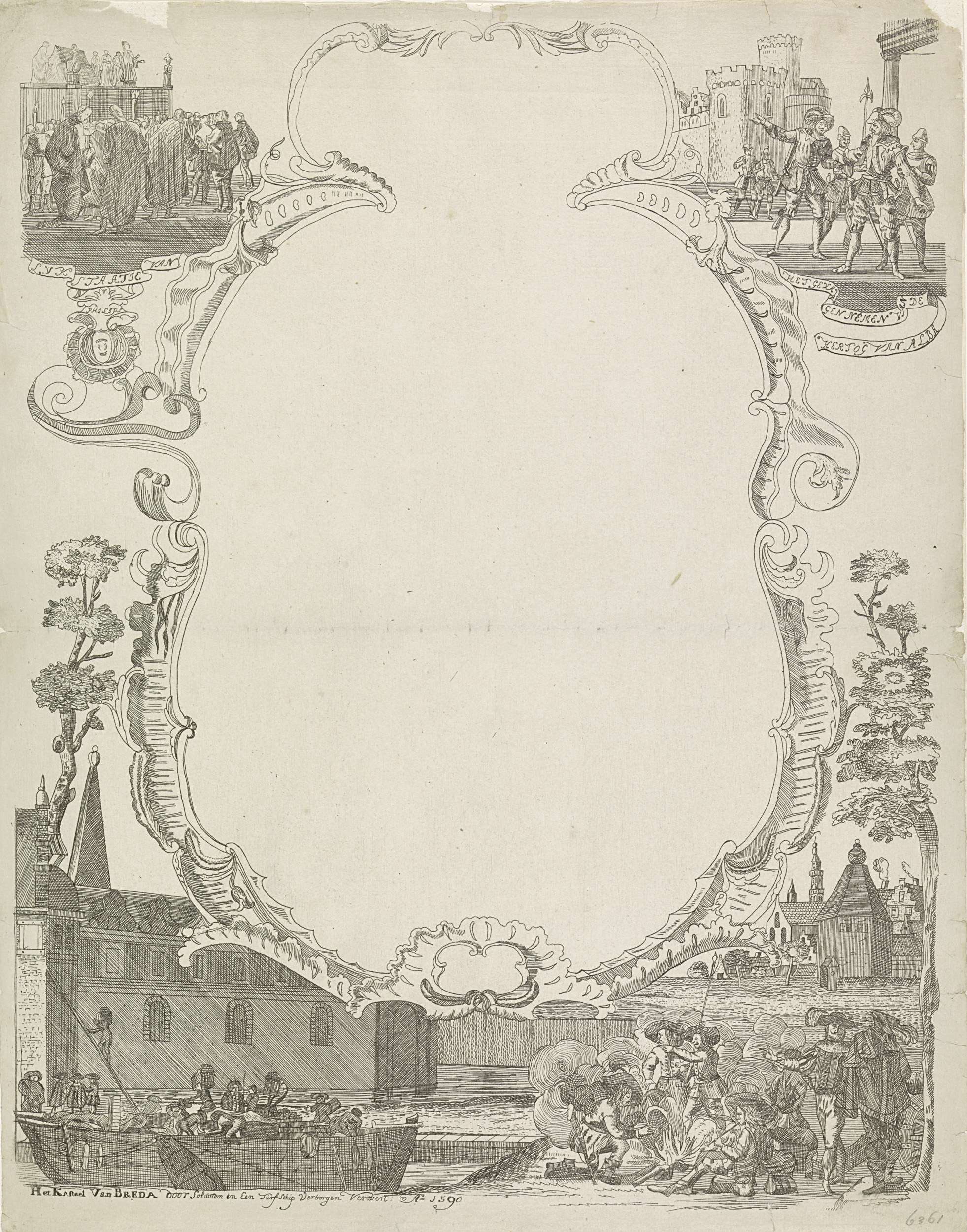 Wensbrief uit ca. 1830 met een onbeschreven cartouche. binnen een kader opgebouwd uit drie historische gebeurtenissen. Boven de gevangenname van de hertog van Alva en lijkstatie van koning Filips II, onderaan het turfschip van Breda.