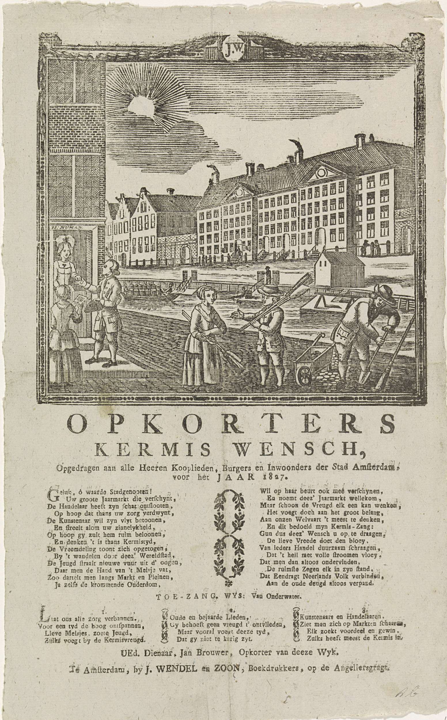 Kermisprent van de Amsterdamse opkorters (straatvegers) voor het jaar 1827. Enkele mannen ruimen het vuil van de straat. Op de achtergrond enkele grote panden aan een gracht. Een man haalt geld op bij een huis. Met een vers in twee kolommen en een lied in drie coupletten. Namens de opkorter van de wijk: Jan Brouwer.