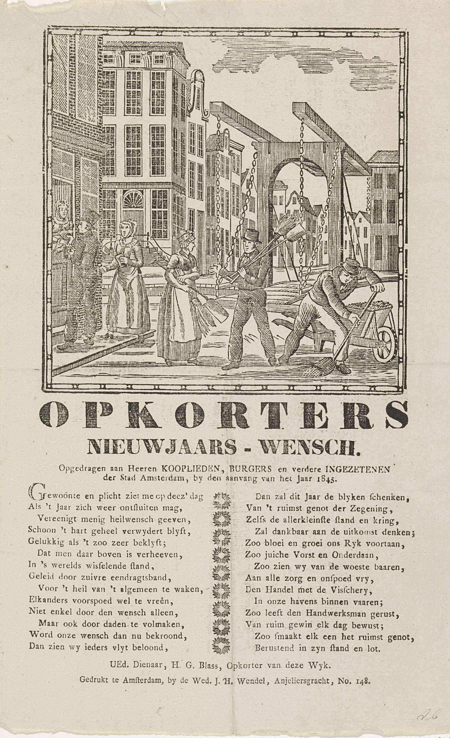Nieuwjaarswens van de Amsterdamse opkorters (straatvegers) voor het jaar 1845. Enkele mannen ruimen het vuil van de straat. Op de achtergrond huizen aan een gracht. Een man haalt geld op bij een huis. Met een vers in twee kolommen. Namens de opkorter van de wijk: H.G. Blass.