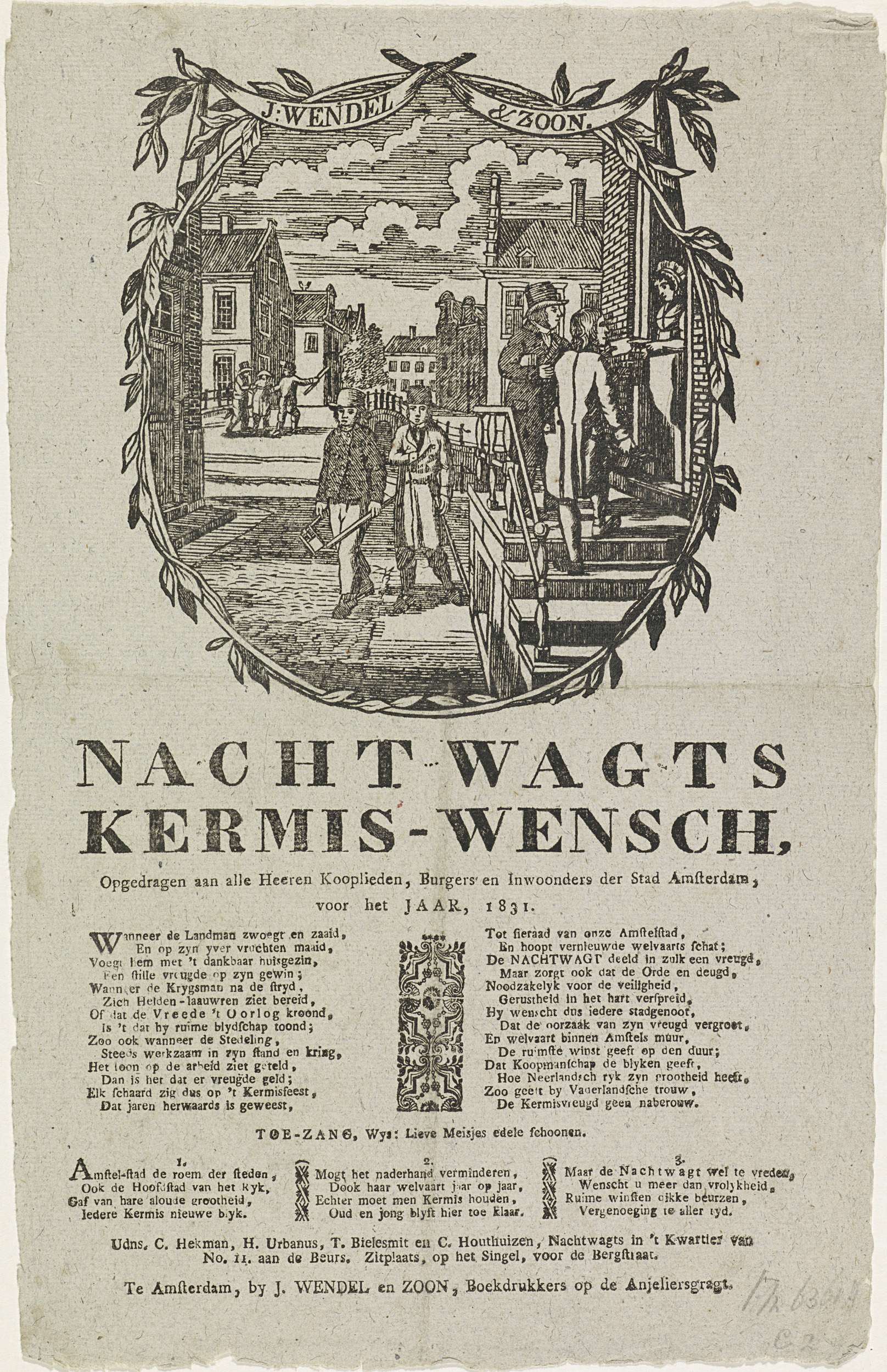 Kermisprent van de Amsterdamse nachtwacht (ratelwacht) voor het jaar 1831. Ovale voorstelling versierd met lauwerbladen. Enkele mannen lopen met ratels door de straten, twee mannen halen geld op bij een huis. Met een vers in twee kolommen en een lied in drie coupletten. Namens de nachtwacht in kwartier No. 11 aan de Beurs: C. Hekman, ...