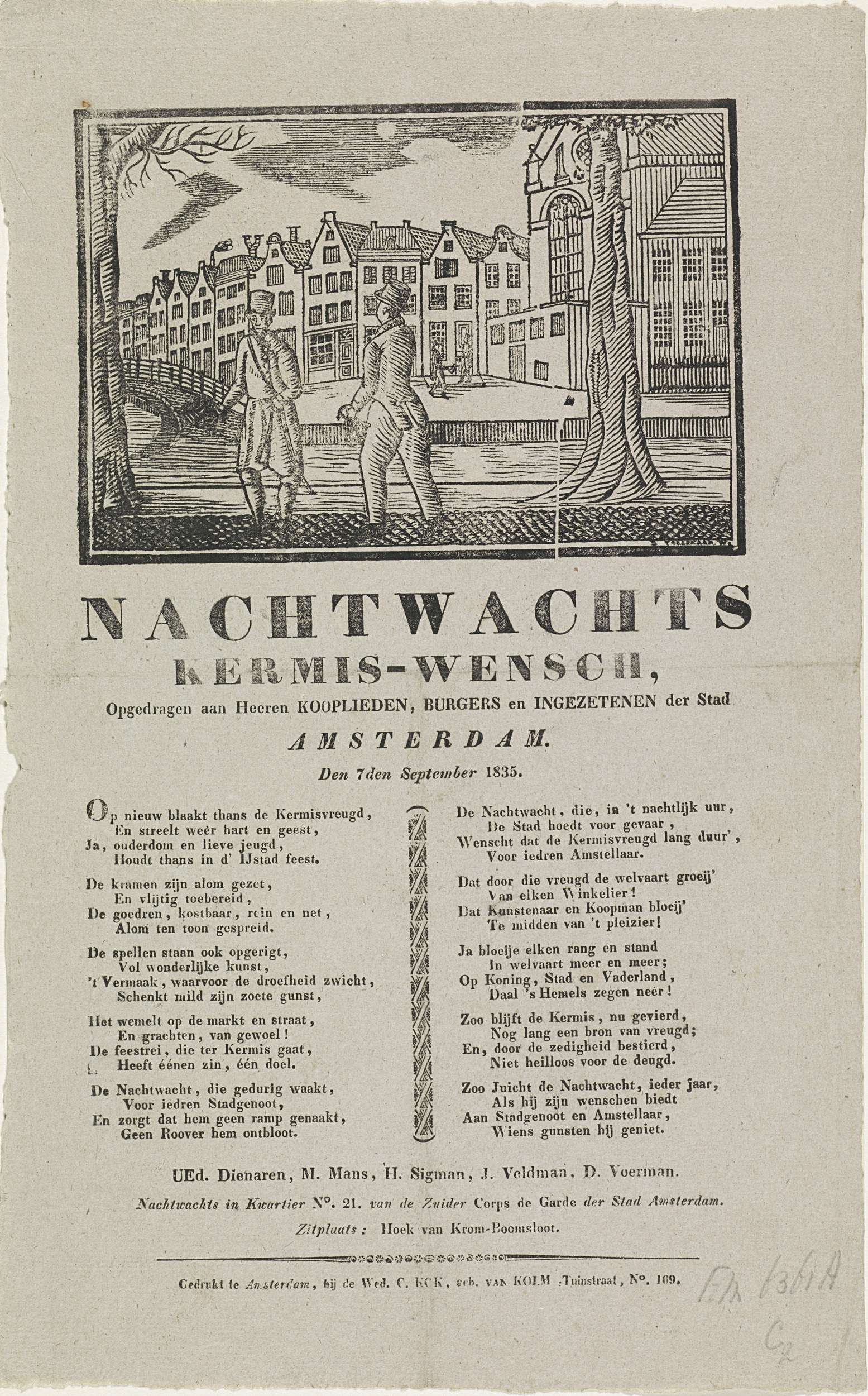 Kermisprent van de Amsterdamse nachtwacht (ratelwacht), 7 september 1835. Enkele mannen lopen 's nachts met ratels langs een gracht. Met een vers in twee kolommen. Namens de nachtwacht in kwartier No. 21 van de Zuider Corps de Garde: M. Mans, H. Sigman, J. Veldman en D. Voerman.