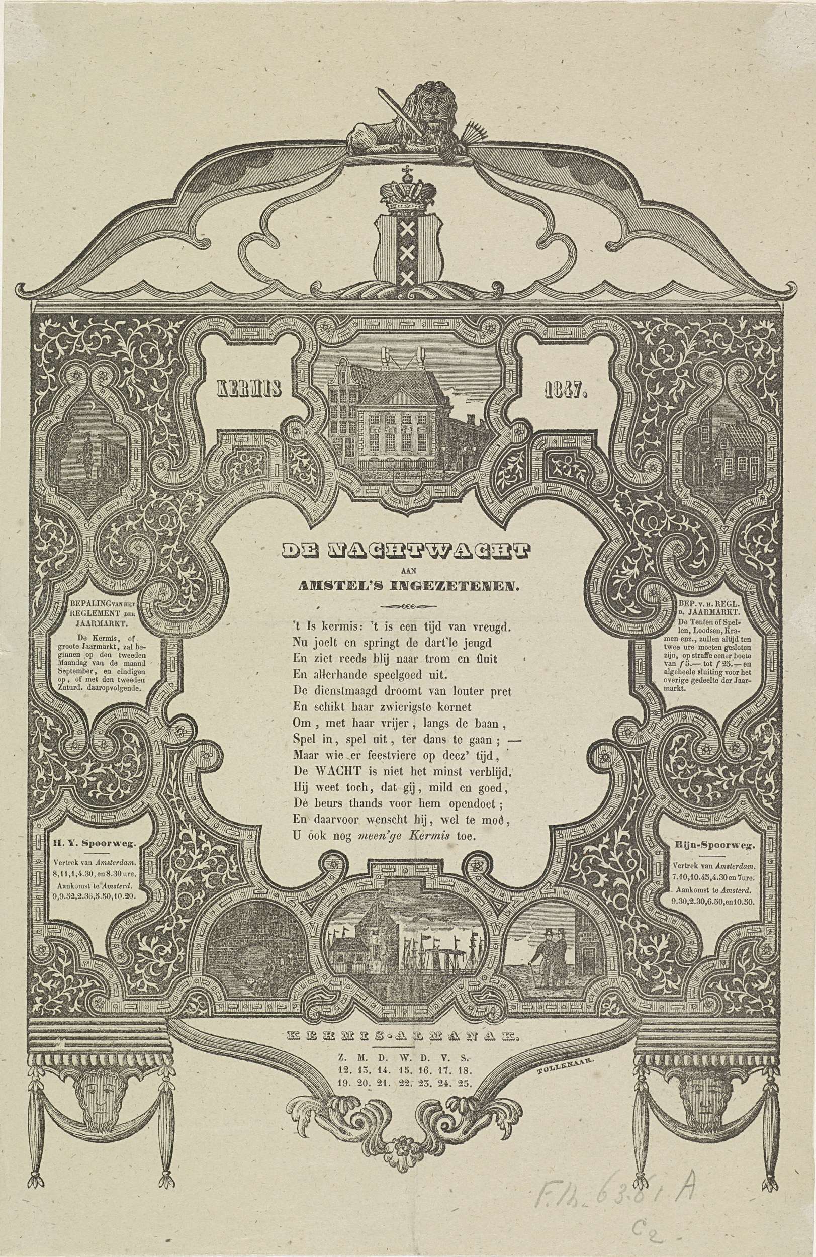 Kermisprent van de Amsterdamse nachtwacht (ratelwacht), september 1847. Randwerk met zes kleine cartouches met afbeeldingen van de nachtwacht en gebouwen in Amsterdam. Ook met vier cartouches met tekst. Centraal een vers, onderaan de kermis-almanak (kalender).