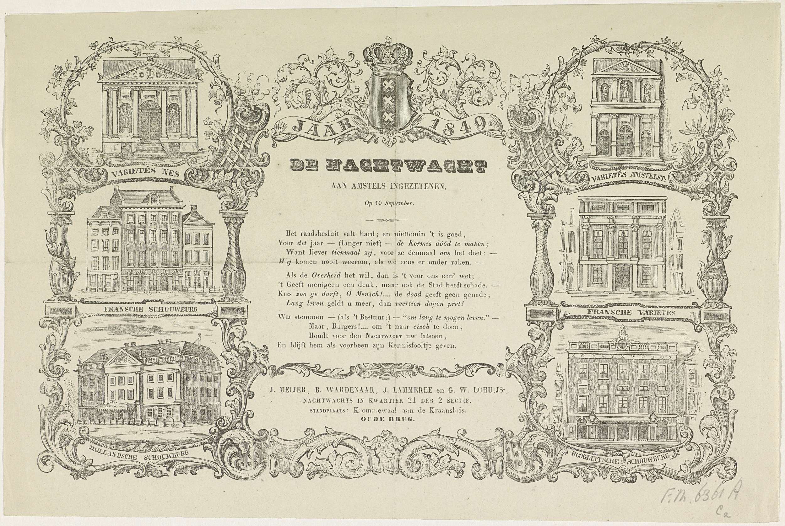 Kermisprent van de Amsterdamse nachtwacht (ratelwacht), 10 september 1849. Tussen bladeren en ranken afbeeldingen van: de Variété aan de Nes, de Franse Schouwburg, de Hollandse Schouwburg, de Oude Salon de Variété in de Amstelstraat, de Franse Variétés en de Hoogduitse schouwburg. Met een vers in drie delen. Namens de nachtwacht in kwartier No. 21 van ...