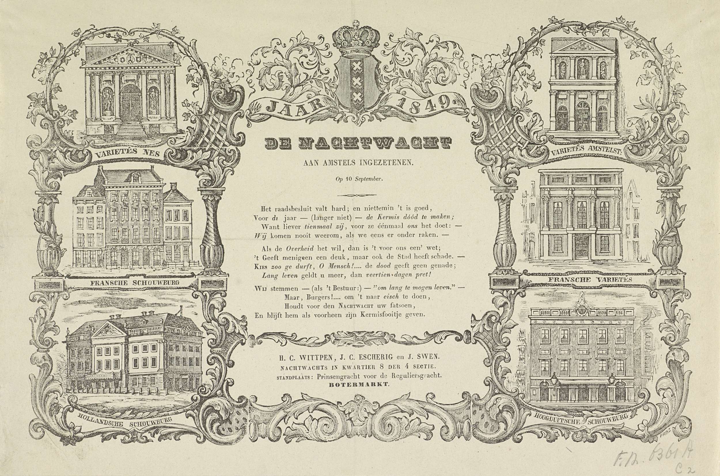 Kermisprent van de Amsterdamse nachtwacht (ratelwacht), 10 september 1849. Tussen bladeren en ranken afbeeldingen van: de Variété aan de Nes, de Franse Schouwburg, de Hollandse Schouwburg, de Oude Salon de Variété in de Amstelstraat, de Franse Variétés en de Hoogduitse schouwburg. Met een vers in drie delen. Namens de nachtwacht in kwartier No. 8 van ...