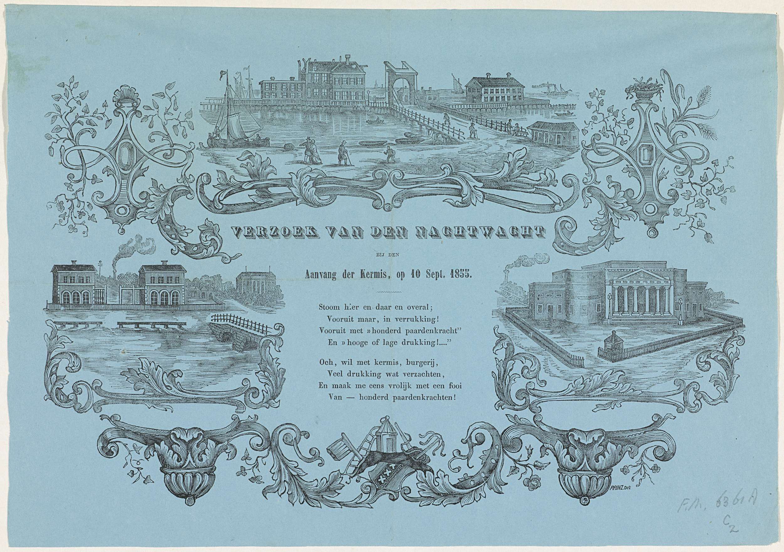 Kermisprent van de Amsterdamse nachtwacht (ratelwacht), 10 september 1855. Drie voorstellingen van gebouwen in verband met stoomkracht: de Nieuwe Stadsherberg, de Weesperpoortstation en het Station Amsterdam Willemspoort van de Nederlandsche Rhijnspoorweg-Maatschappij. Centraal een gedicht in twee verzen.