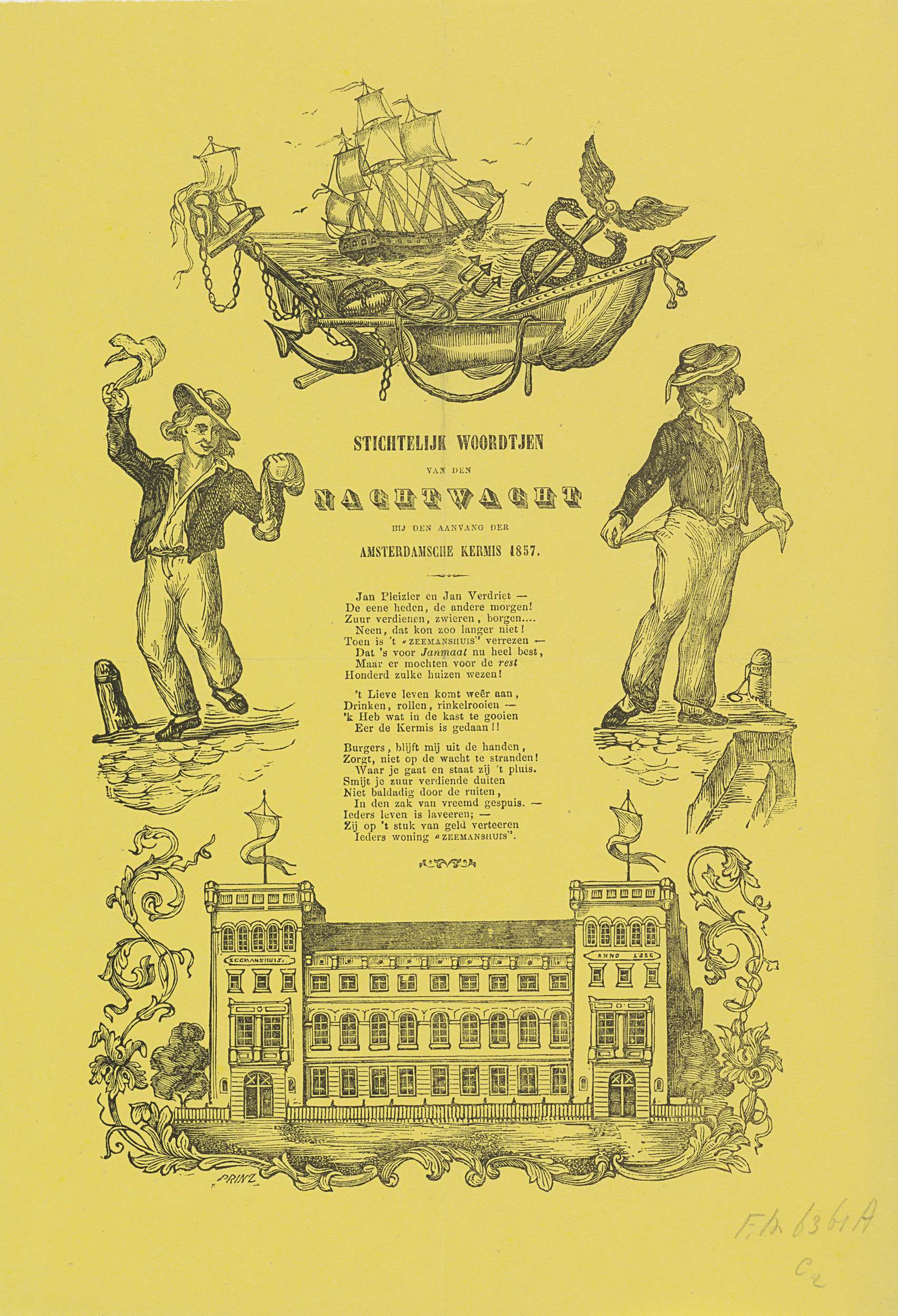 Kermisprent van de Amsterdamse nachtwacht (ratelwacht), september 1857. Twee voorstellingen van een vrolijke zeeman (met geld) en een sombere (met lege zakken) zeeman, onderaan het nieuwe Zeemanshuis te Amsterdam. Bovenaan een schip op zee en attributen van de zeevaart. Centraal een gedicht in drie verzen.