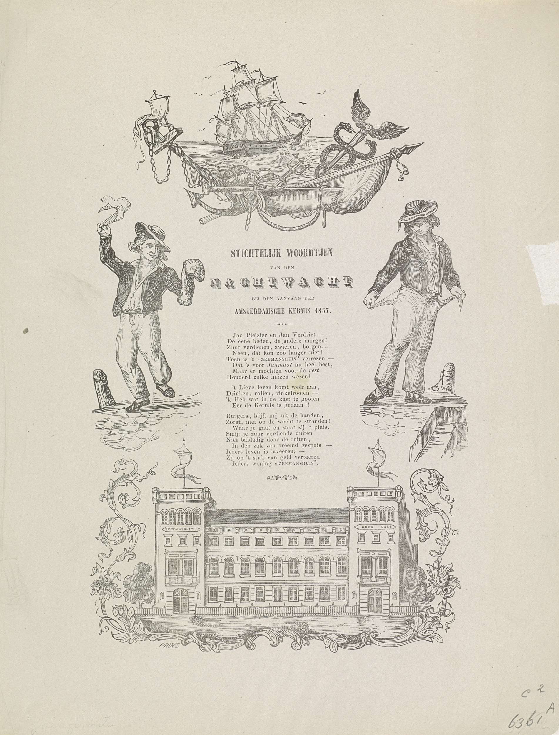 Kermisprent van de Amsterdamse nachtwacht (ratelwacht), september 1857. Twee voorstellingen van een vrolijke zeeman (met geld) en een sombere (met lege zakken) zeeman, onderaan het nieuwe Zeemanshuis te Amsterdam. Bovenaan een schip op zee en attributen van de zeevaart. Centraal een gedicht in drie verzen.