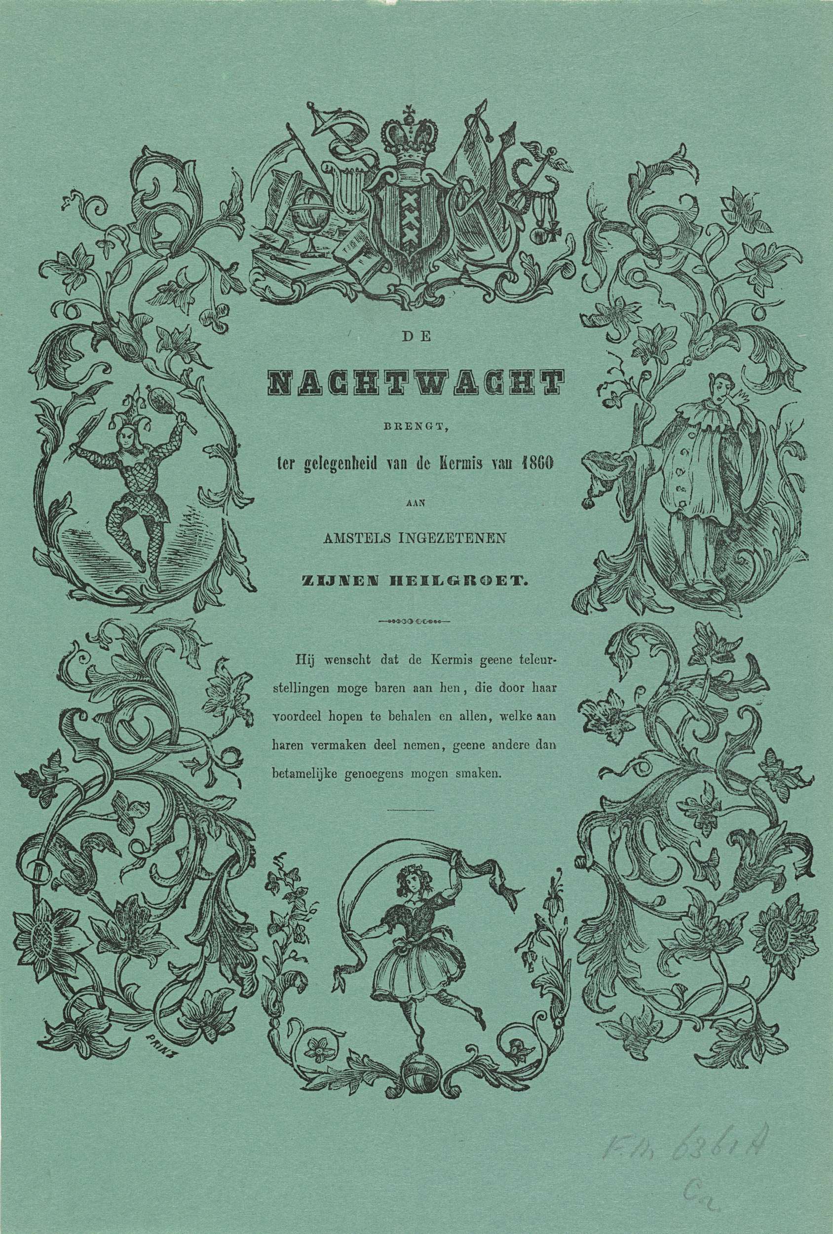 Kermisprent van de Amsterdamse nachtwacht (ratelwacht), september 1860. Centraal een gedicht, daaromheen bladranken en drie figuren uit de Commedia dell'arte: Harlekijn, Pierrot en Colombina.