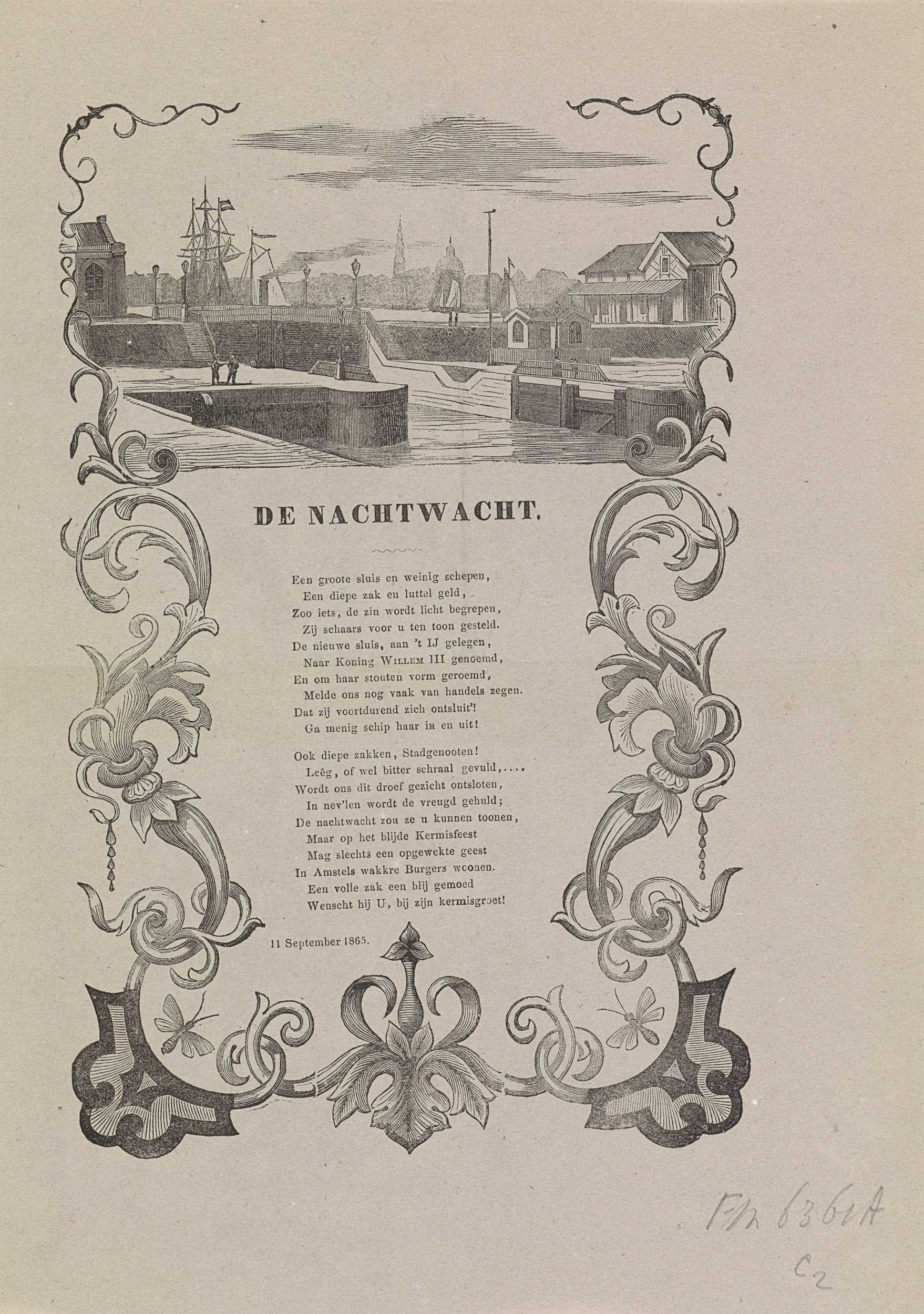 Kermisprent van de Amsterdamse nachtwacht (ratelwacht), 11 september 1865. Centraal een gedicht, daarboven de nieuwe sluis aan het IJ genoemd naar koning Willem III (Willemsluizen).