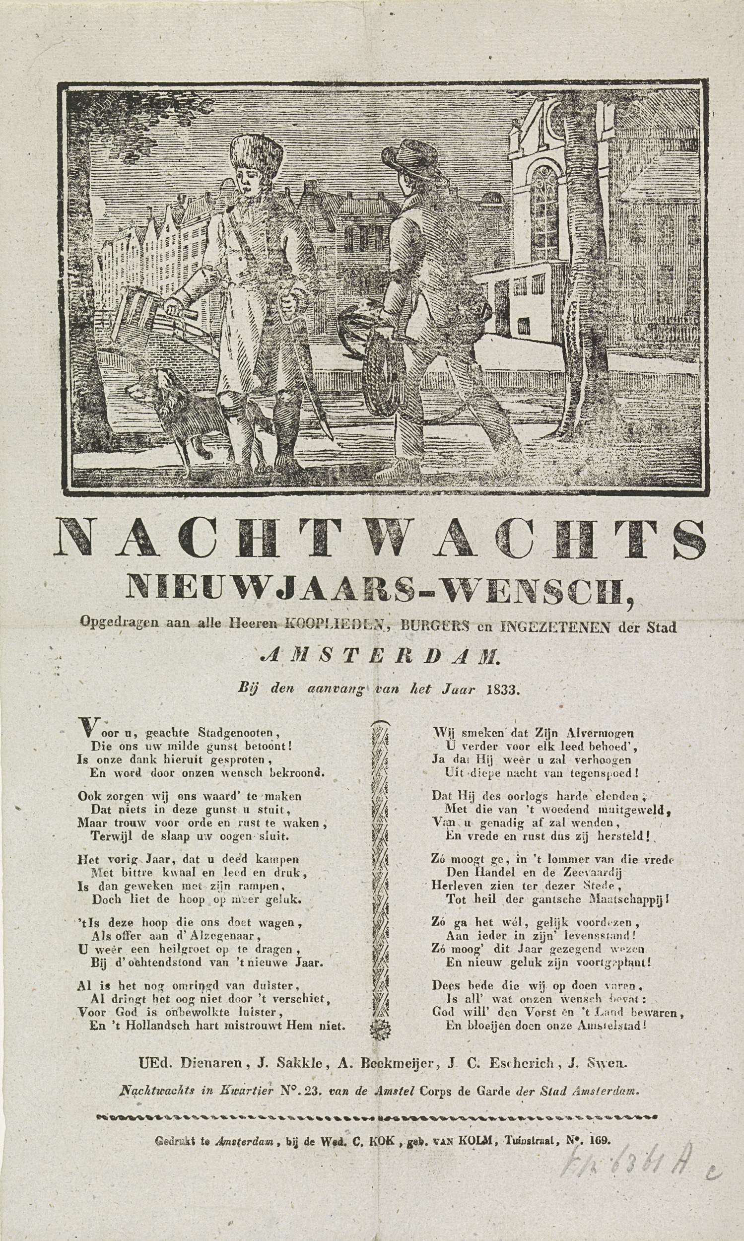 Nieuwjaarswens van de Amsterdamse nachtwacht (ratelwacht) voor het jaar 1833. Een lid van de nachtwacht lopend met een ratel bij het Amstelveld in Amsterdam. Met een vers in twee kolommen. Namens de nachtwacht in kwartier No. 23 van de Amstel Corps de Garde der stad Amsterdam: J. Sakkle, A. Beekmeijer, J.C. Escherich en J. Swen.