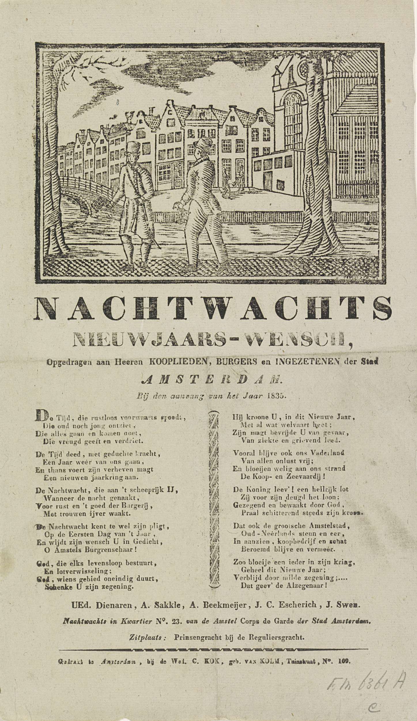 Nieuwjaarswens van de Amsterdamse nachtwacht (ratelwacht) voor het jaar 1835. Twee leden van de nachtwacht lopend met een ratel bij het Amstelveld in Amsterdam. Met een vers in twee kolommen. Namens de nachtwacht in kwartier No. 23 van de Amstel Corps de Garde der stad Amsterdam: J. Sakkle, A. Beekmeijer, J.C. Escherich en J. Swen.