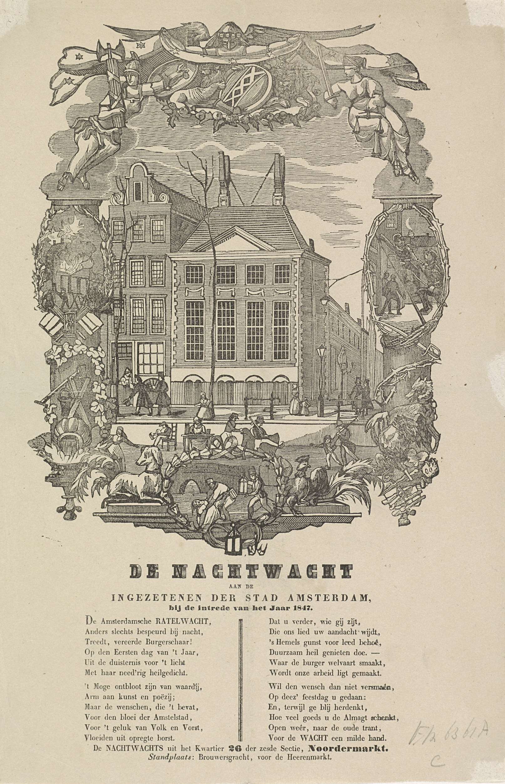 Nieuwjaarswens van de Amsterdamse nachtwacht (ratelwacht) voor het jaar 1847. Centraal het Politiebureau op de Oudezijds Achterburgwal 183-185 met de Spinhuissteeg. Met schaatsers op het ijs. Binnen een kader met kleine voorstellingen van het werk van de nachtwacht. Met een vers in twee kolommen. Namens de nachtwacht in kwartier No. 26 van de 6de Sectie, ...