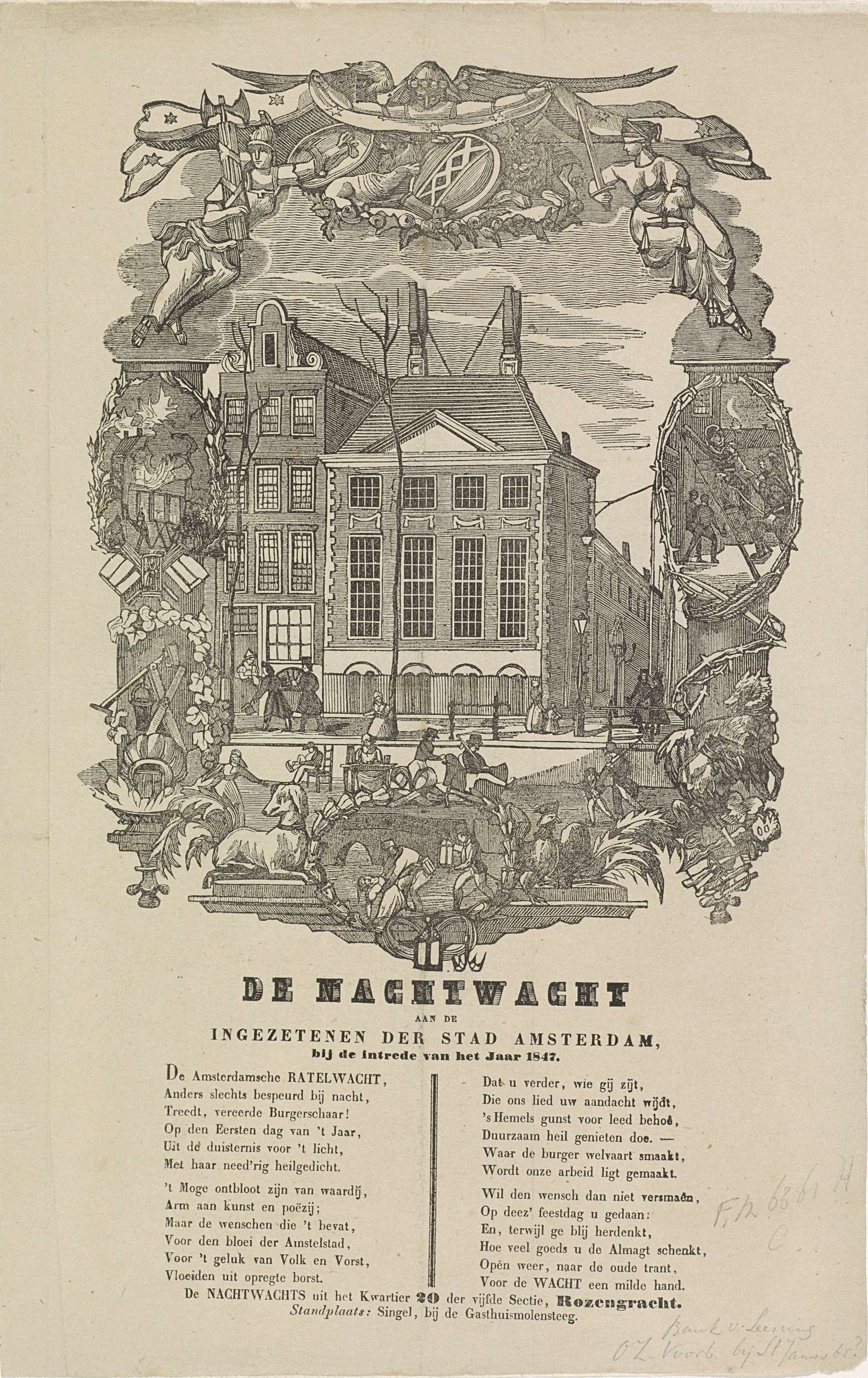 Nieuwjaarswens van de Amsterdamse nachtwacht (ratelwacht) voor het jaar 1847. Centraal het Politiebureau op de Oudezijds Achterburgwal 183-185 met de Spinhuissteeg. Met schaatsers op het ijs. Binnen een kader met kleine voorstellingen van het werk van de nachtwacht. Met een vers in twee kolommen. Namens de nachtwacht in kwartier No. 20 van de 5e Sectie, ...