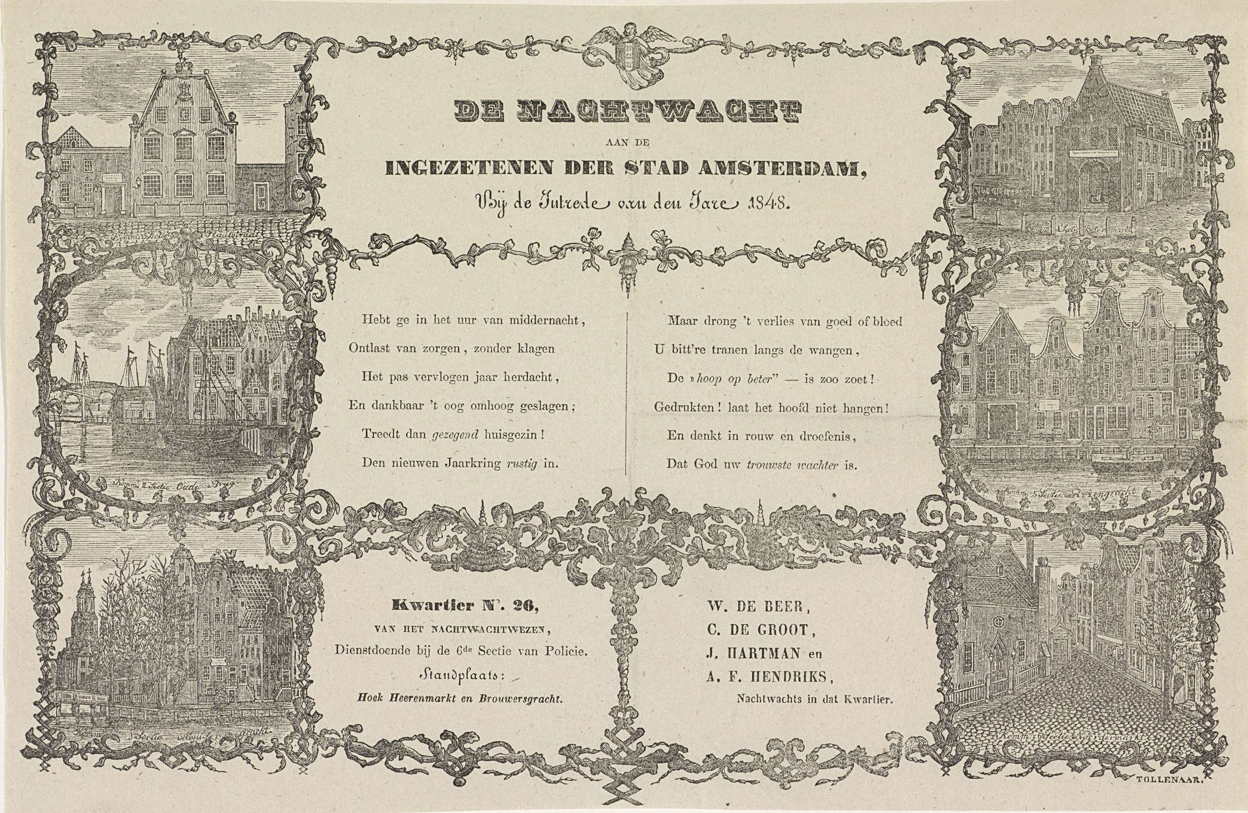 Nieuwjaarswens van de Amsterdamse nachtwacht (ratelwacht) voor het jaar 1848. Centraal een gedicht in twee kolommen, aan weerszijden zes gezichten op de sectiebureaus Amsterdam: Staalstraat, Oude Brug, Muidergracht, Botermarkt, Rozengracht en Noordermarkt. Namens de nachtwacht in kwartier No. 26 van het nachtwachtwezen dienstdoende bij de 6e Sectie van Policie: W. de Beer, C. de Groot, ...