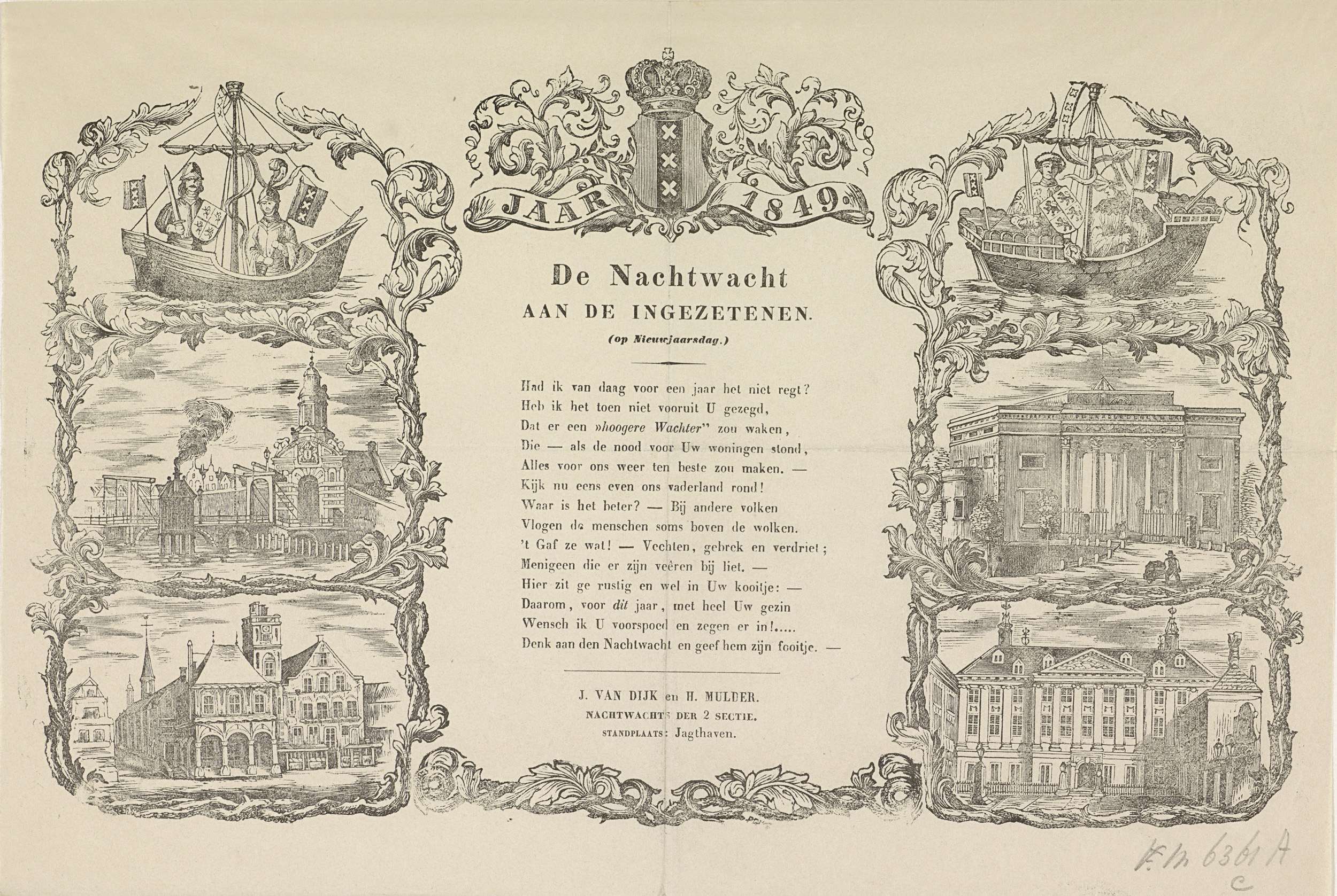Nieuwjaarswens van de Amsterdamse nachtwacht (ratelwacht) voor het jaar 1849. Centraal een gedicht, aan weerszijden twee keer het Amsterdamse koggeschip en vier gezichten op oude en nieuwe gebouwen: oude en nieuwe Haarlemmerpoort, oude en nieuwe stadhuis. Namens de nachtwacht van de 2e Sectie: J. van Dijk en H. Mulder.