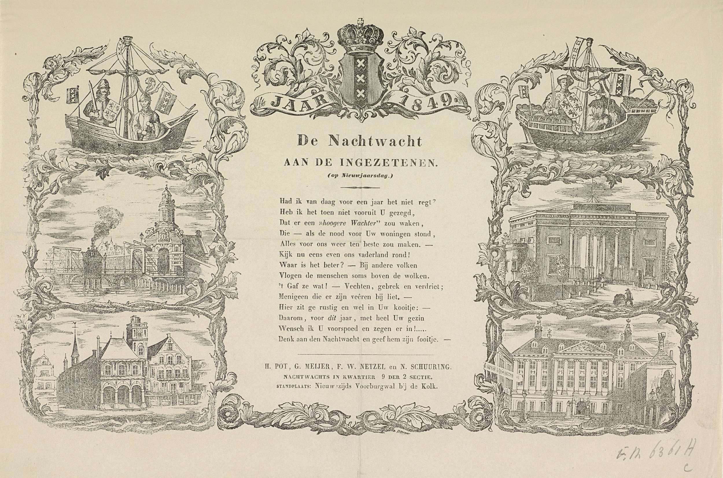 Nieuwjaarswens van de Amsterdamse nachtwacht (ratelwacht) voor het jaar 1849. Centraal een gedicht, aan weerszijden twee keer het Amsterdamse koggeschip en vier gezichten op oude en nieuwe gebouwen: oude en nieuwe Haarlemmerpoort, oude en nieuwe stadhuis. Namens de nachtwacht van kwartier 9 van de 2e Sectie: H. Pot, G. Meijer, F.W. Netzel en N. Schuuring.