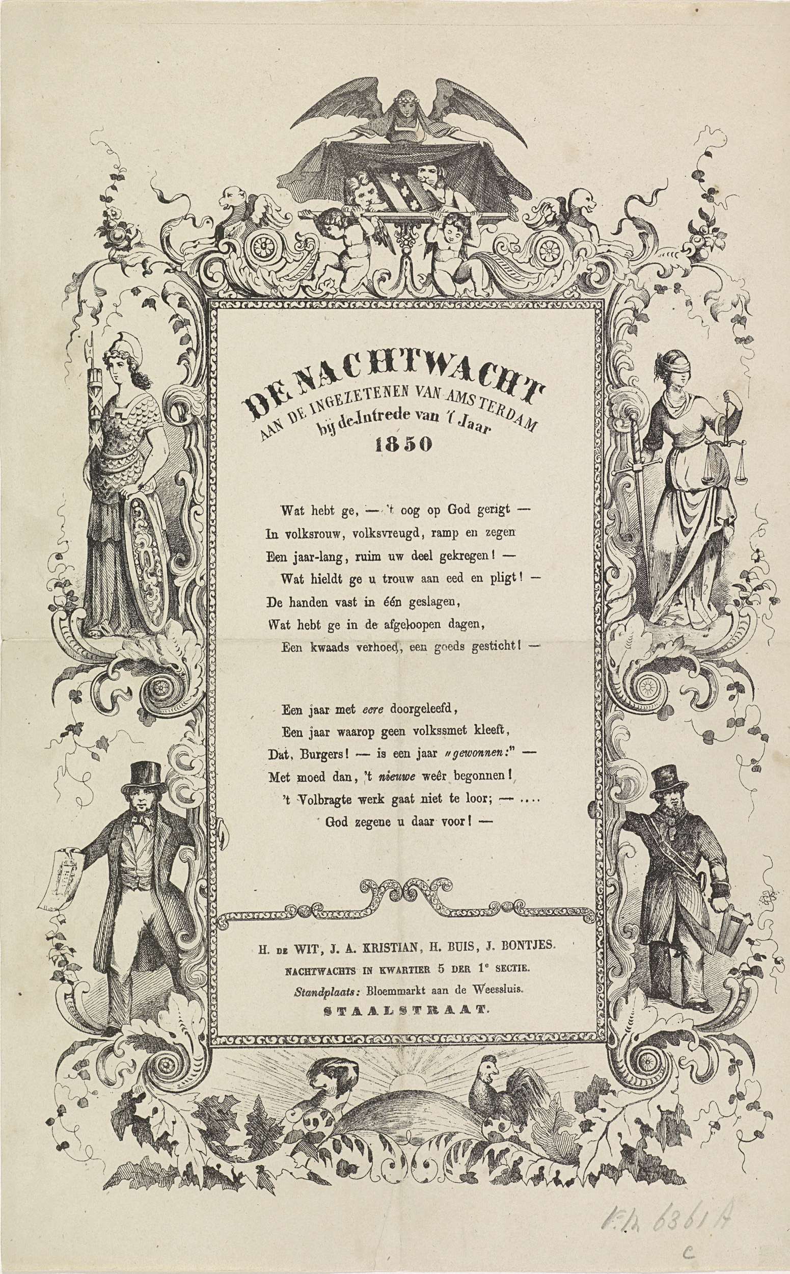 Nieuwjaarswens van de Amsterdamse nachtwacht (ratelwacht) voor het jaar 1850. Centraal een gedicht binnen een kader versierd met figueren en bladranken. Boven Minerva en Justitia, onder twee nachtwachten. Namens de nachtwacht van kwartier 5 van de 1e Sectie: H. de Wit, J.A. Kristian, H. Buis en J. Bontjes.