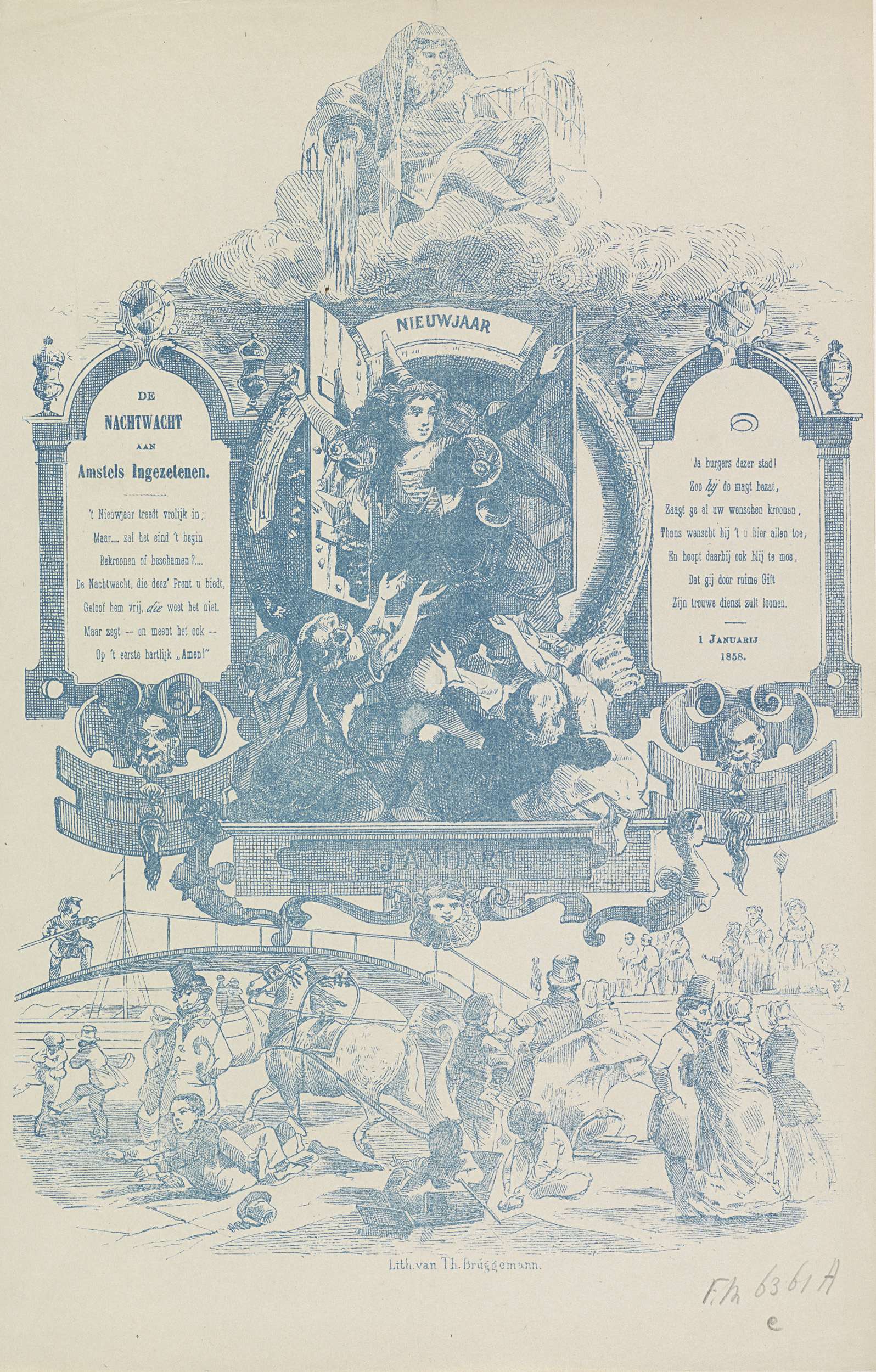 Nieuwjaarswens van de Amsterdamse nachtwacht (ratelwacht) voor het jaar 1858. Een jonge vrouw, de personificatie van het nieuwe jaar, gooit de luiken open, daaronder kinderen met uitgestrekte armen. Links en rechts een vers. Bovenaan koning Winter, onderaan ijsvermaak.