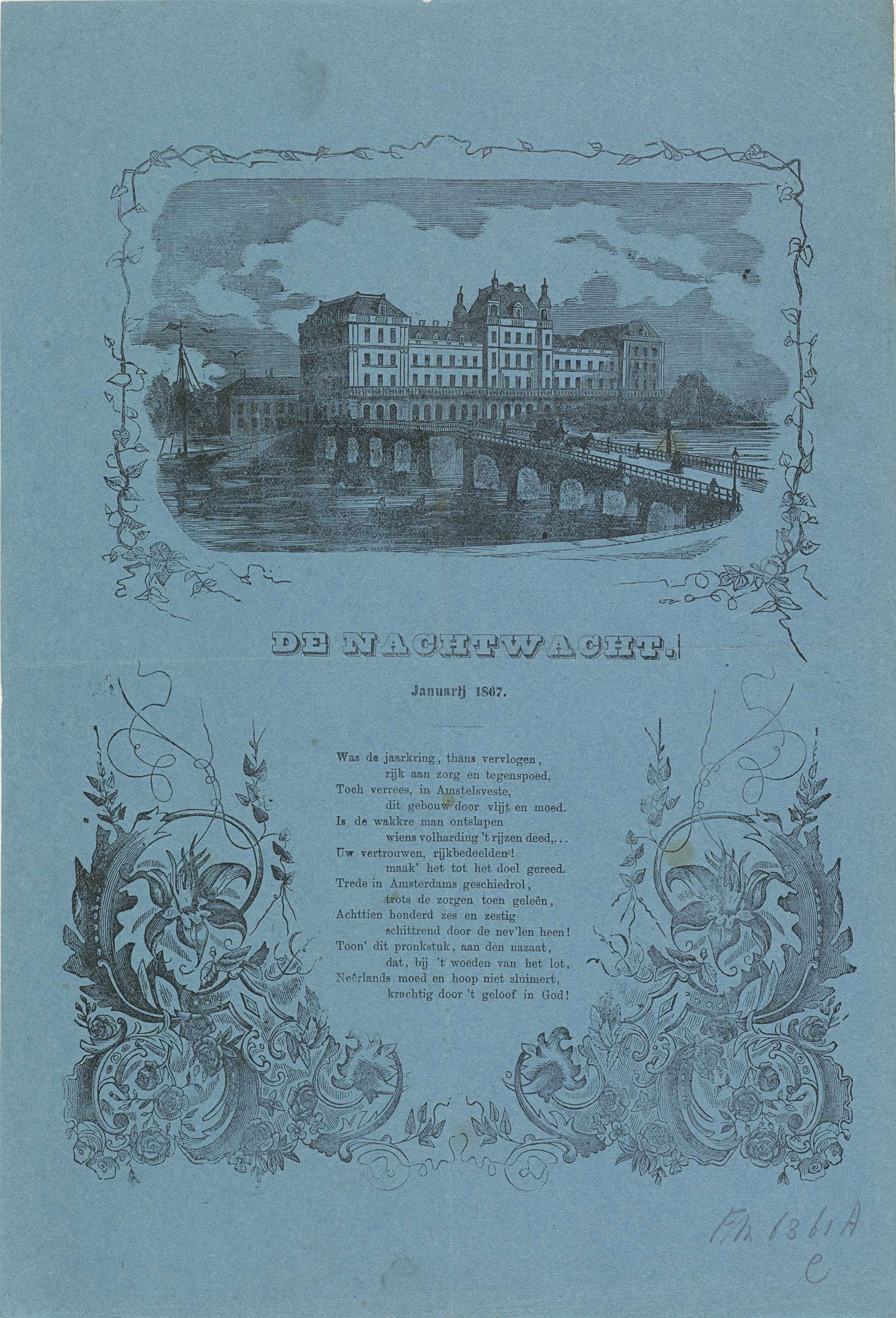 Nieuwjaarswens van de Amsterdamse nachtwacht (ratelwacht) voor het jaar 1867. Onderaan een gedicht, bovenaan een gezicht op het Amstelhotel.
