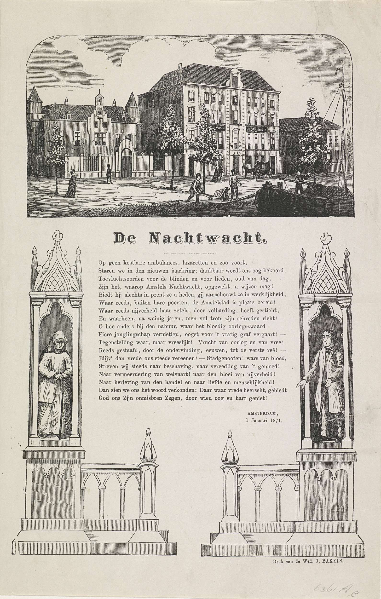 Nieuwjaarswens van de Amsterdamse nachtwacht (ratelwacht) voor het jaar 1871. Centraal een gedicht, bovenaan een gezicht op de het Instituut voor Blinden (Stadhouderskade 84) en links daarvan het Henriëttehofje (Stadhouderskade 85). Aan weerszijden van het gedicht beelden van een staande blinde man en vrouw in een nis. De tekst van het gedicht refereert aan de ...