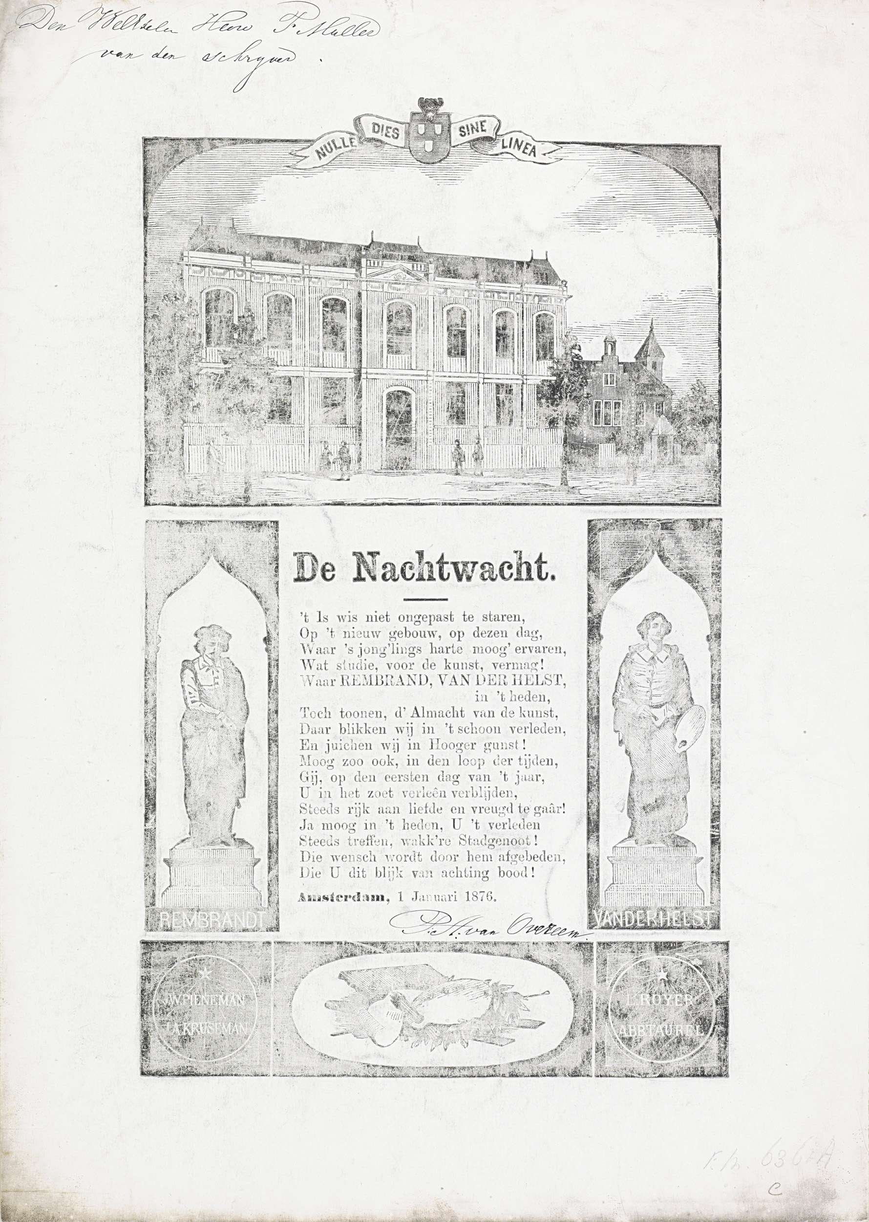 Nieuwjaarswens van de Amsterdamse nachtwacht (ratelwacht) voor het jaar 1876. Centraal een gedicht in twee verzen, bovenaan een gezicht het nieuwe gebouw van de Rijksakademie aan de Stadhouderskade. Ter weerszijden van het gedicht afbeeldingen van de standbeelden van Rembrandt (onthuld 1852) en Bartholomeus van der Helst (nooit uitgevoerd). Onderaan vignetten met de namen van J.W. ...
