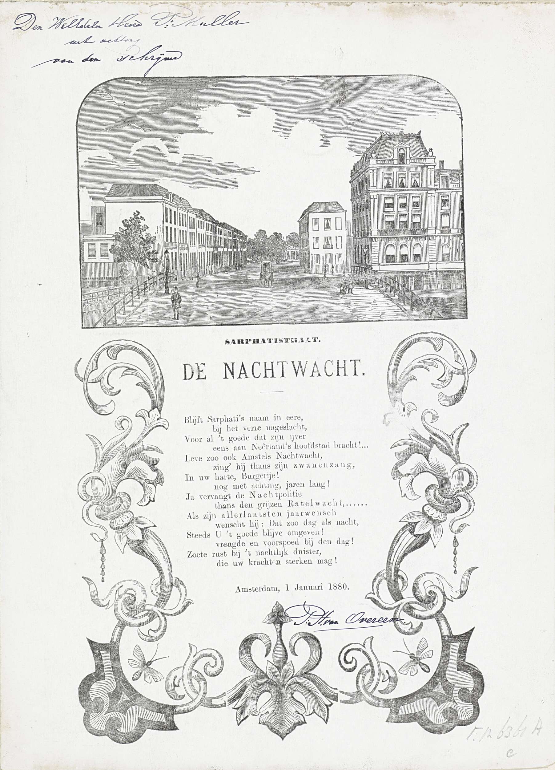 Nieuwjaarswens van de Amsterdamse nachtwacht (ratelwacht) voor het jaar 1880. Centraal een gedicht tussen bladranken. Bovenaan een gezicht op de Sarphatistraat gezien vanaf de Hogesluis. Rechts het Amstel Hotel.