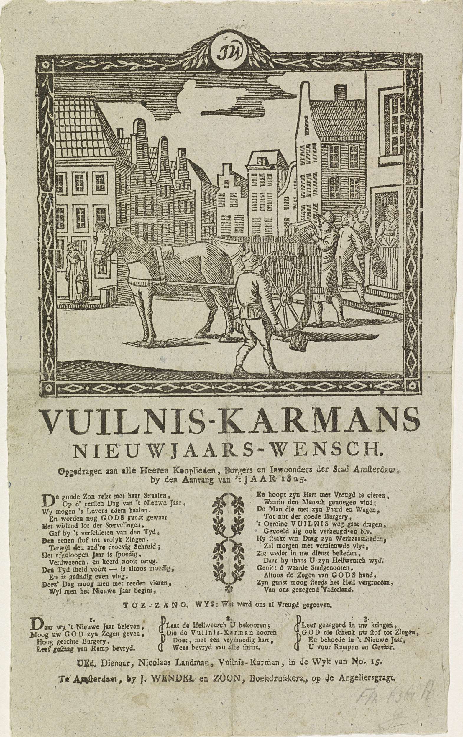 Nieuwjaarswens van de Amsterdamse vuilnismannen voor het jaar 1825. Gezicht in een straat te Amsterdam waar twee mannen met een kar het vuil ophalen. Twee andere mannen halen bij een huis geld op. Met gedicht in twee kolommen en een lied in drie verzen. Van de vuilniskarman in de wijk no. 15: Nicolaas Landman.
