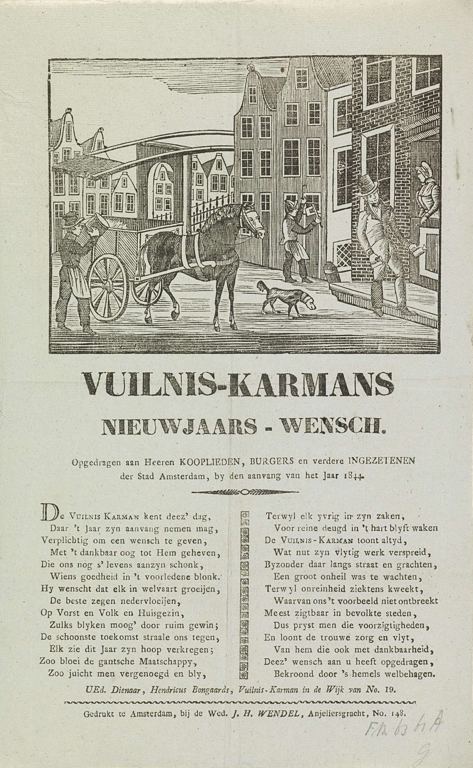 Nieuwjaarswens van de Amsterdamse vuilnismannen voor het jaar 1844. Gezicht in een straat te Amsterdam, waar een man een vuilnisemmer in de kar leegkiepert en een andere man met de ratel draait. Een andere man haalt bij een huis geld op. Met gedicht in twee kolommen. Van de vuilniskarman in de wijk no. 19: Hendricus ...