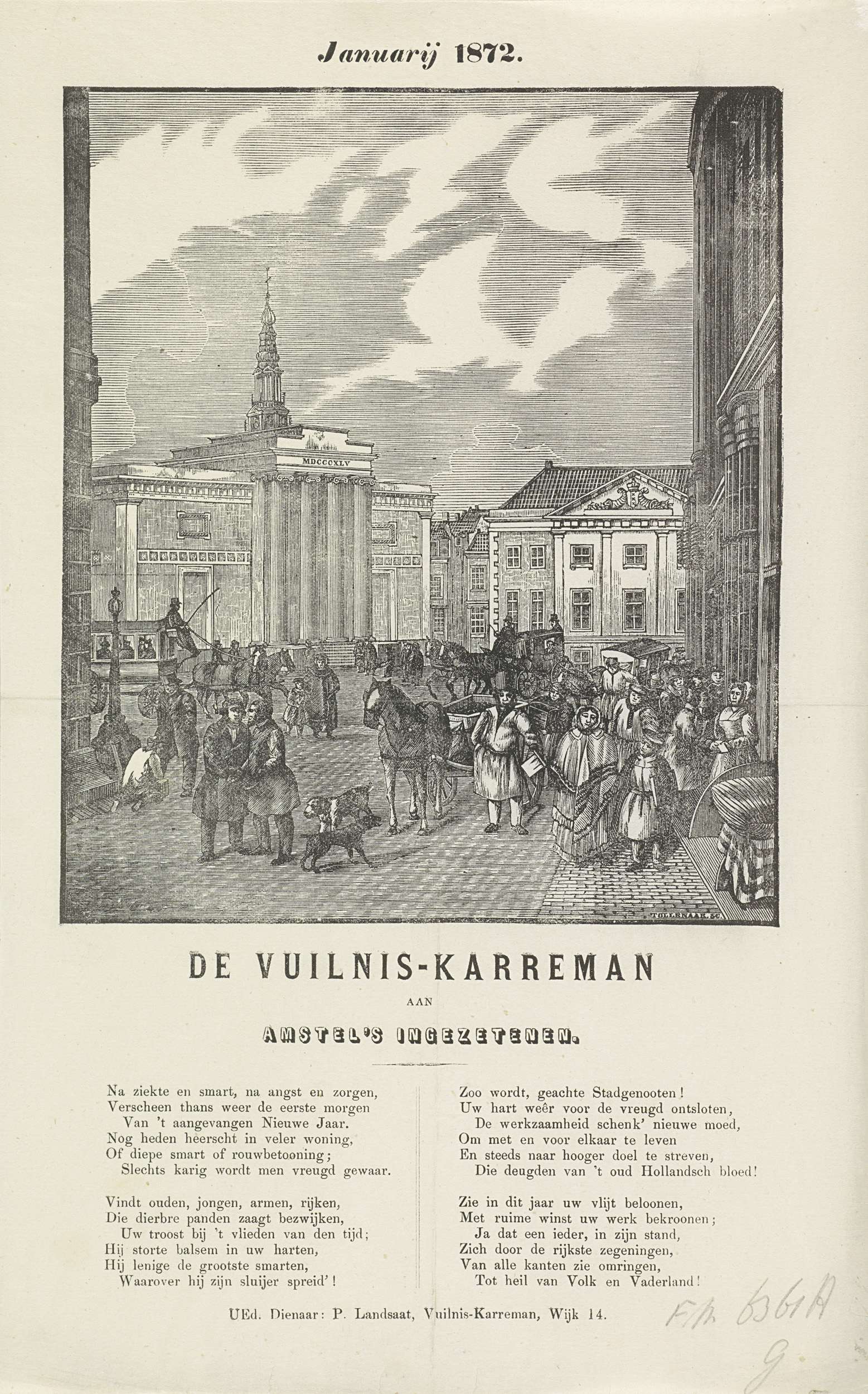 Nieuwjaarswens van de Amsterdamse vuilnismannen voor het jaar 1872. Gezicht met op de Dam met de Beurs van Zocher en het Commandantshuis te Amsterdam. Tussen het publiek de vuilnismannen met hun kar. Met gedicht in twee kolommen. Van de vuilniskarman in de wijk no. 14: P. Landsaat.