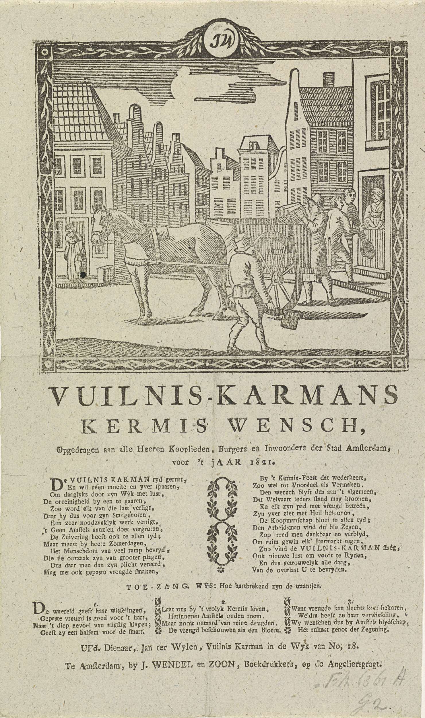 Kermisprent van de Amsterdamse vuilnismannen voor het jaar 1821. Gezicht met in een straat te Amsterdam waar een man een vuilnisemmer leeggooit in de kar en een andere man met de ratel draait. Twee andere mannen halen bij een huis geld op. Met gedicht in twee kolommen en een lied in drie verzen. Van de ...
