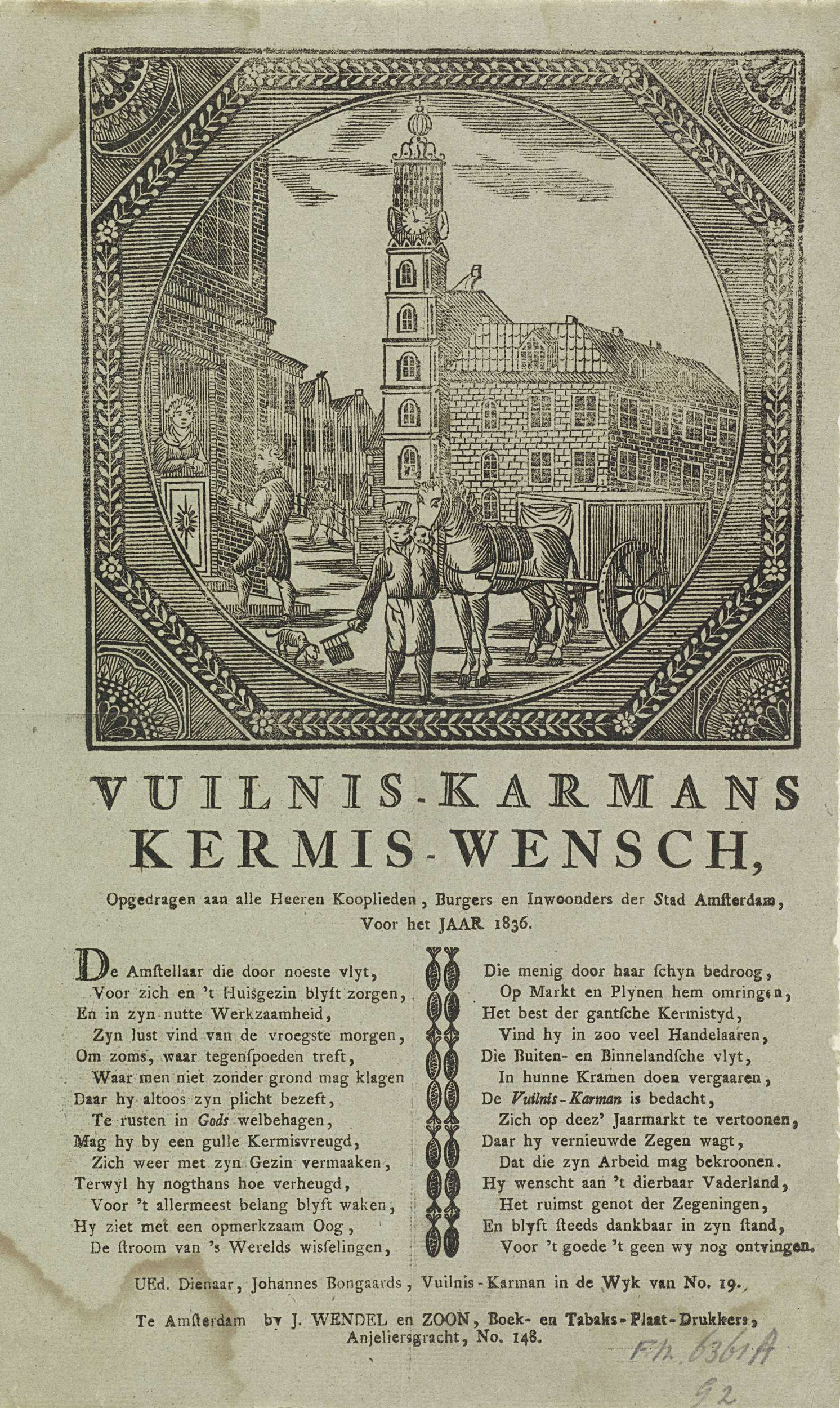 Kermisprent van de Amsterdamse vuilnismannen voor het jaar 1836. Ronde voorstelling binnen achtkantige rand met een gezicht bij de Munt te Amsterdam waar een man met een ratel bij een vuilniskar staat. Een andere man haalt bij een huis geld op. Met gedicht in twee kolommen. Van de vuilniskarman in de wijk no. 19: Johannes ...