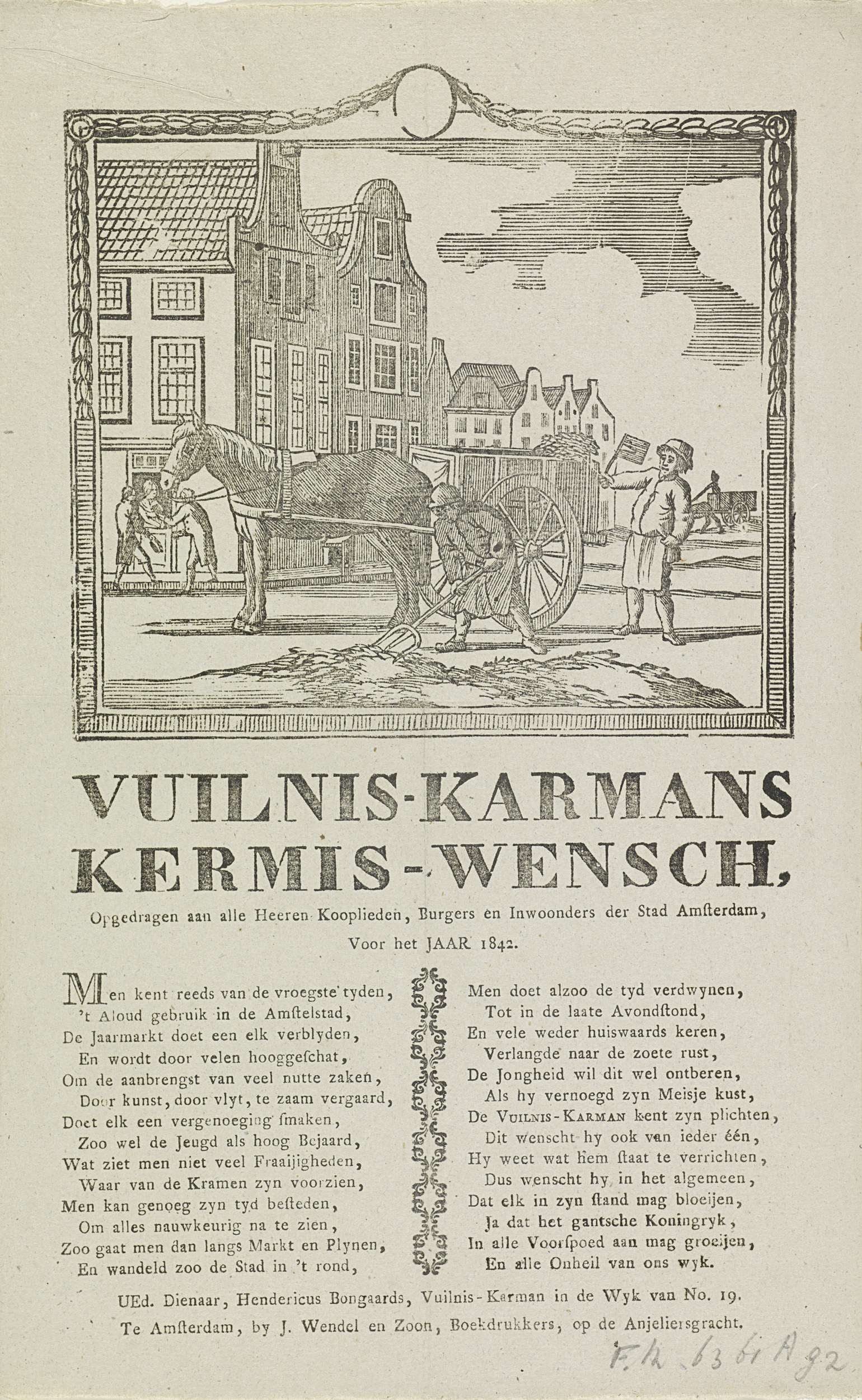 Kermisprent van de Amsterdamse vuilnismannen voor het jaar 1842. Gezicht in een straat te Amsterdam waar een man met een kar vuil van straat schept, bij hem een man met een ratel. Twee andere mannen halen bij een huis geld op. Met gedicht in twee kolommen. Van de vuilniskarman in de wijk no. 19: Hendericus ...