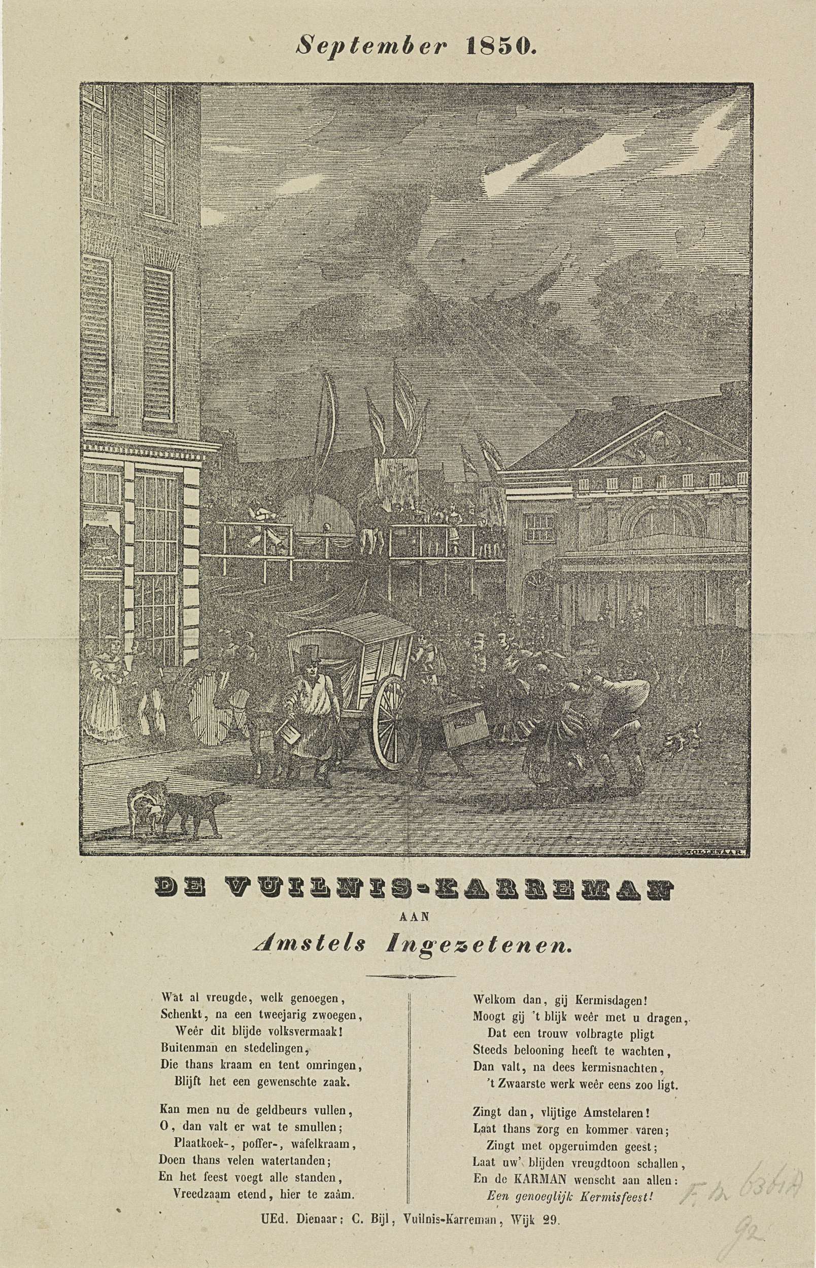 Kermisprent van de Amsterdamse vuilnismannen voor het jaar 1850. Gezicht op de kermis op de Botermarkt met de oude Waag. Op de markt twee vuilniskarren. Met gedicht in twee kolommen. Van de vuilniskarman in de wijk no. 29: C. Bijl.