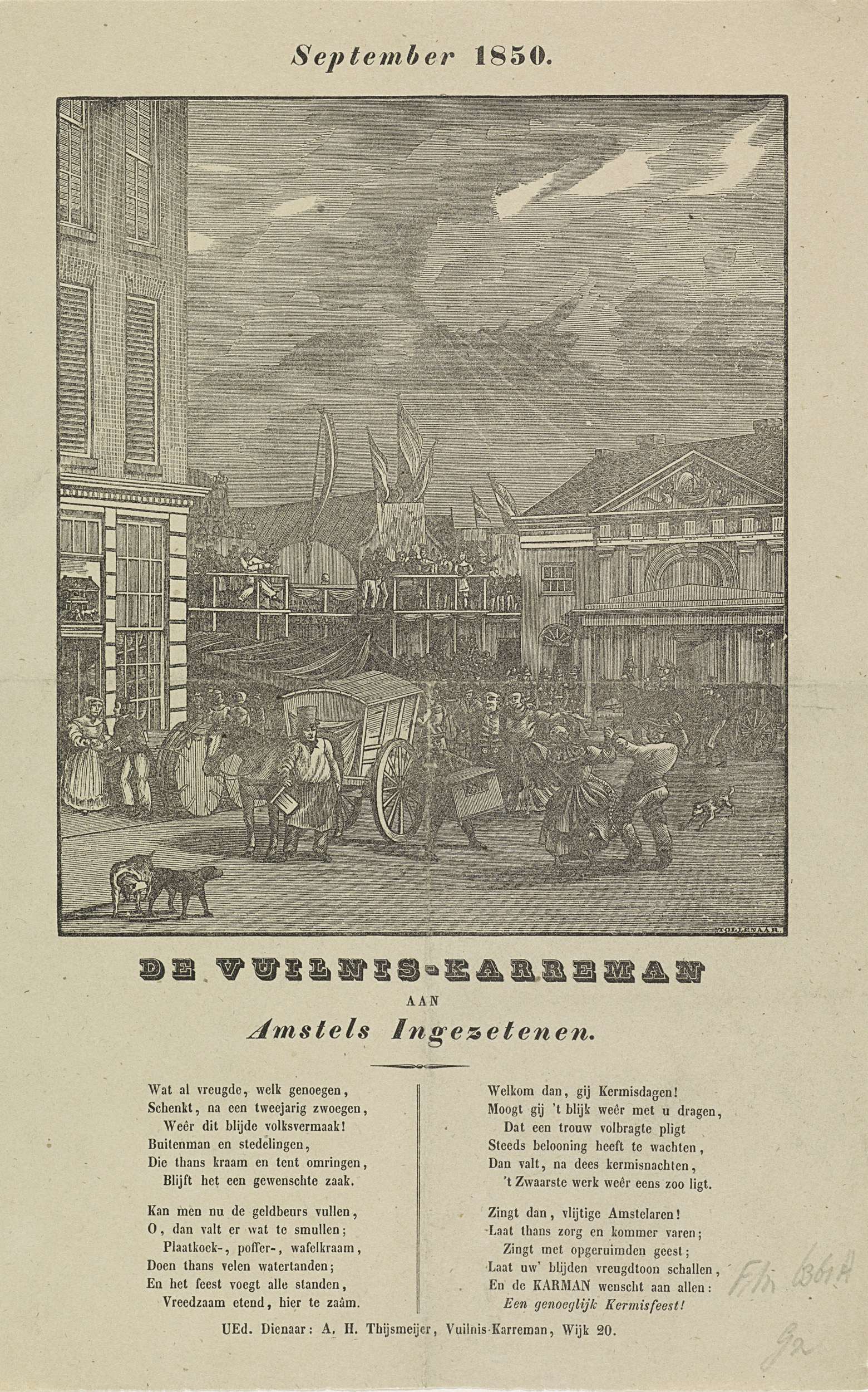 Kermisprent van de Amsterdamse vuilnismannen voor het jaar 1850. Gezicht op de kermis op de Botermarkt met de oude Waag. Op de markt twee vuilniskarren. Met gedicht in twee kolommen. Van de vuilniskarman in de wijk no. 20: A.H. Thijsmeijer.