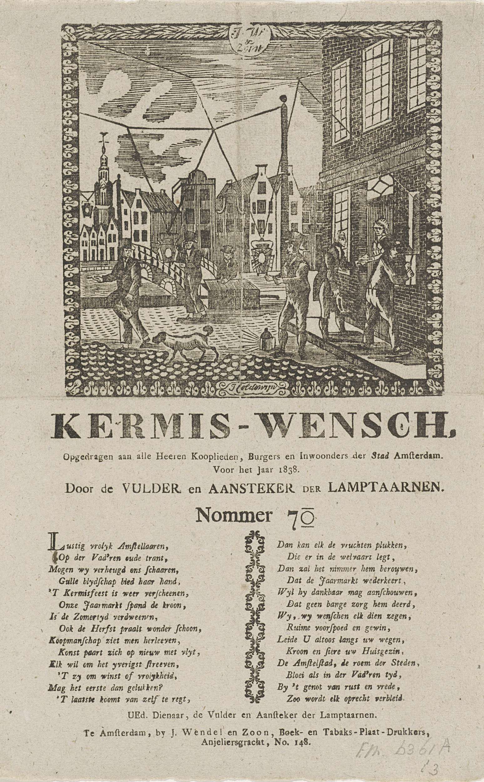 Kermisprent van de Amsterdamse lantaarnopstekers en vullers voor het jaar 1838. Gezicht in een straat in Amsterdam waar enkele mannen bezig zijn de straatlantaarns te vullen en aan te steken. Een andere man haalt geld op bij een huis. Met gedicht in twee kolommen. Van de lantaarnopstekers in wijk no. 70.