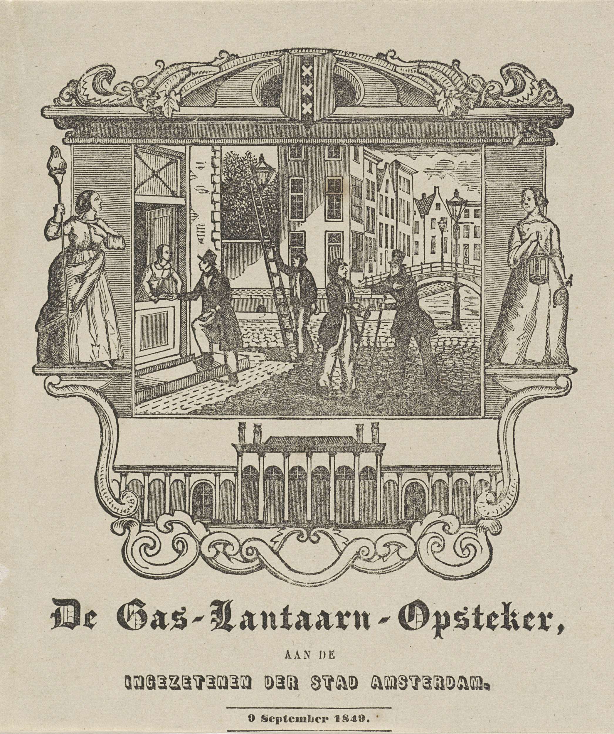Kermisprent van de Amsterdamse gaslantaarnopstekers, 9 september 1849. Cartouche met een gezicht in een straat in Amsterdam waar enkele mannen bezig zijn de straatlantaarns aan te steken. Een andere man haalt geld op bij een huis. Links en rechts een staande vrouw met een fakkel en een olielantaarn, onderaan de Amsterdamse gasfabriek.