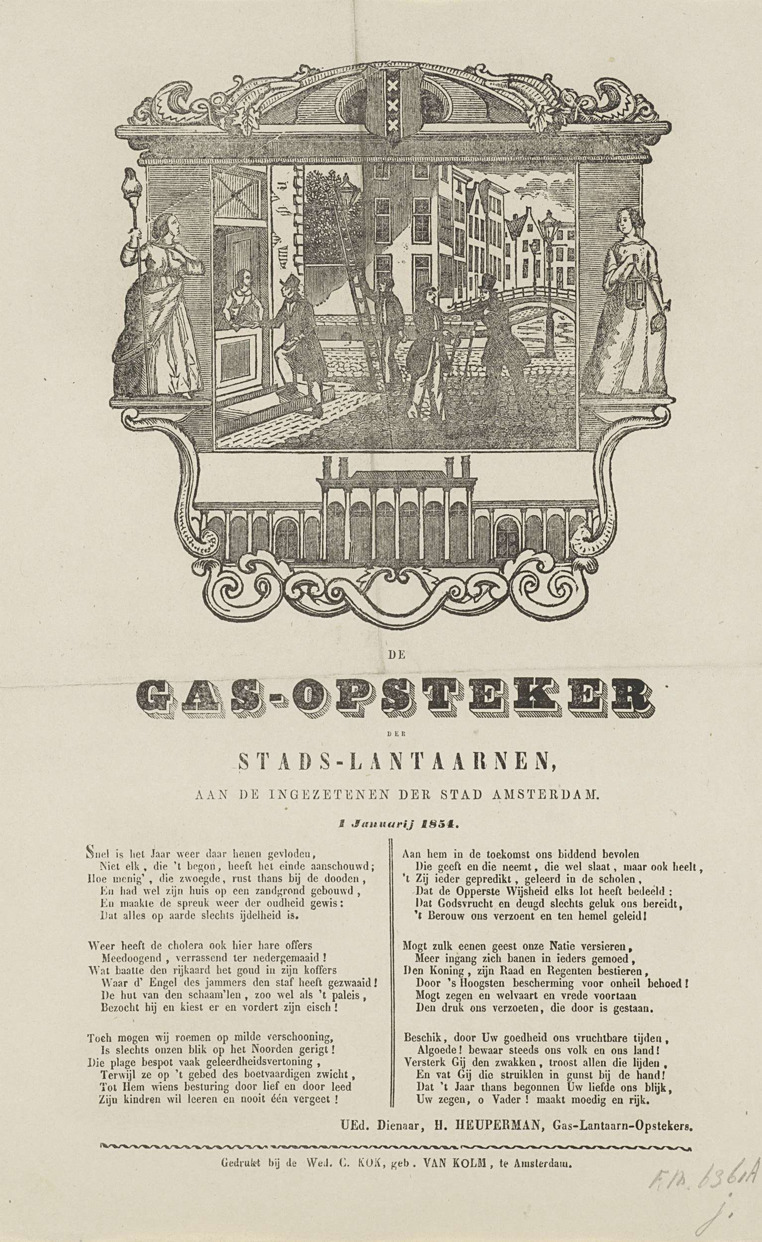 Nieuwjaarswens van de gaslantaarnopstekers van Amsterdam voor het jaar 1854
