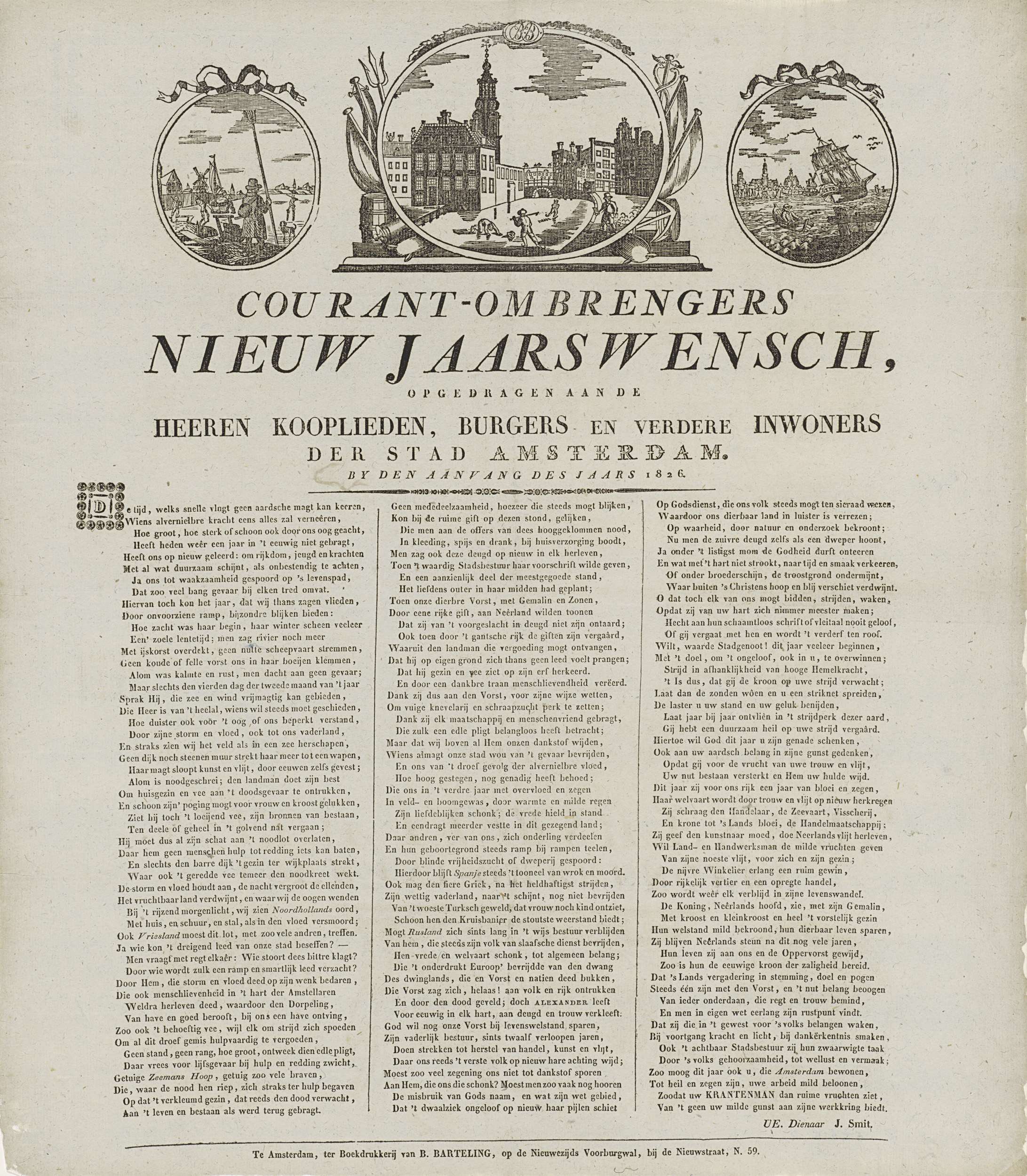 Nieuwjaarswens namens de ombrengers van couranten (krantenbezorgers) te Amsterdam voor het jaar 1826. Bovenaan drie medaillons met centraal een gezicht op schaatsers op het Singel bij de Munt met op de kade een krantenbezorger, links ijsvermaak buiten de stadswal en rechts een schip op het IJ. Onderaan een gedicht in drie kolommen. Van de courantombrenger: ...