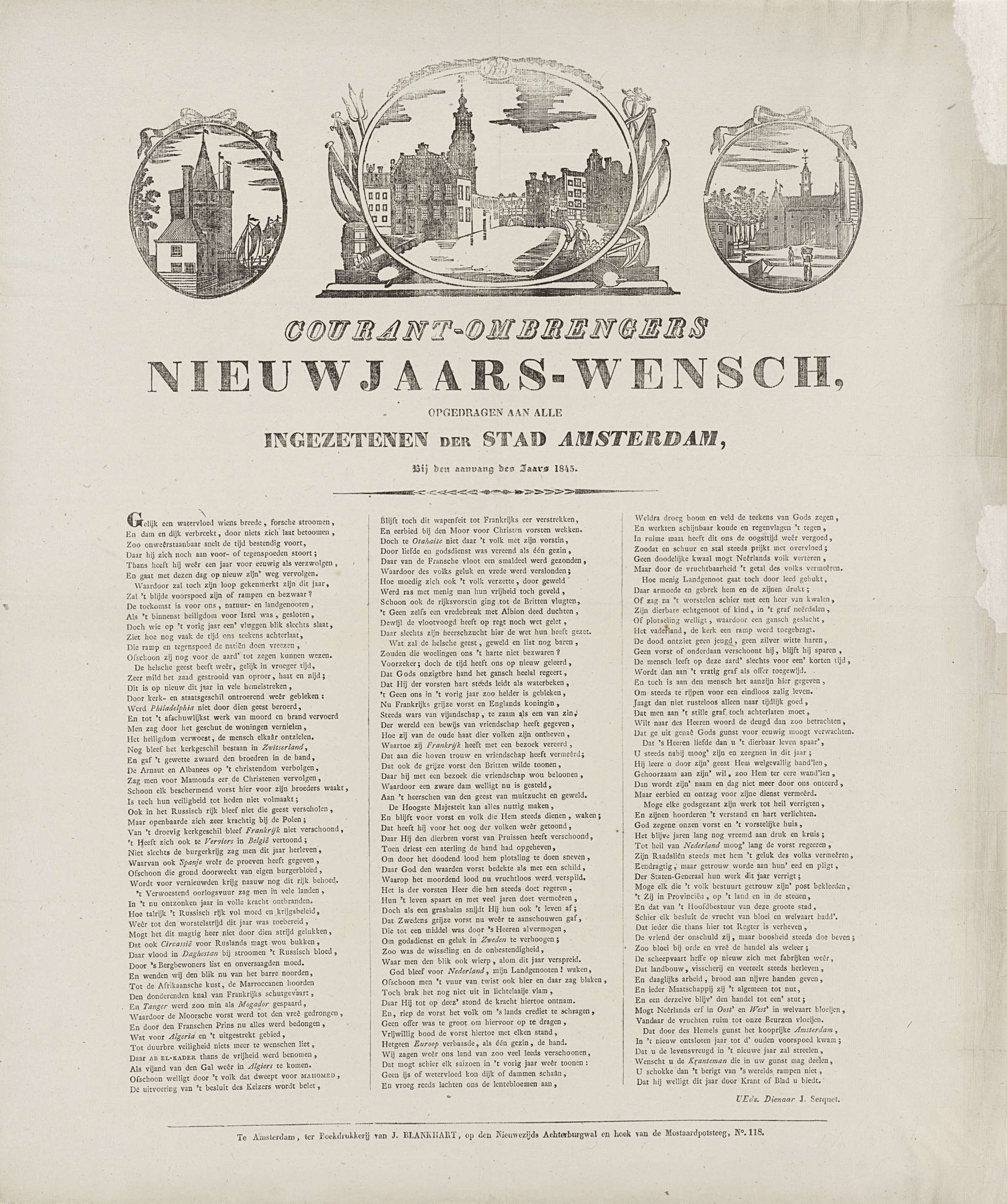 Nieuwjaarswens namens de ombrengers van couranten (krantenbezorgers) te Amsterdam voor het jaar 1845. Bovenaan drie medaillons met centraal een gezicht op het Singel bij de Munt met op de kade een krantenbezorger, links de Schreierstoren, rechts de Leidsepoort. Onderaan een gedicht in vier kolommen. Van de courantombrenger: J. Starreveld.