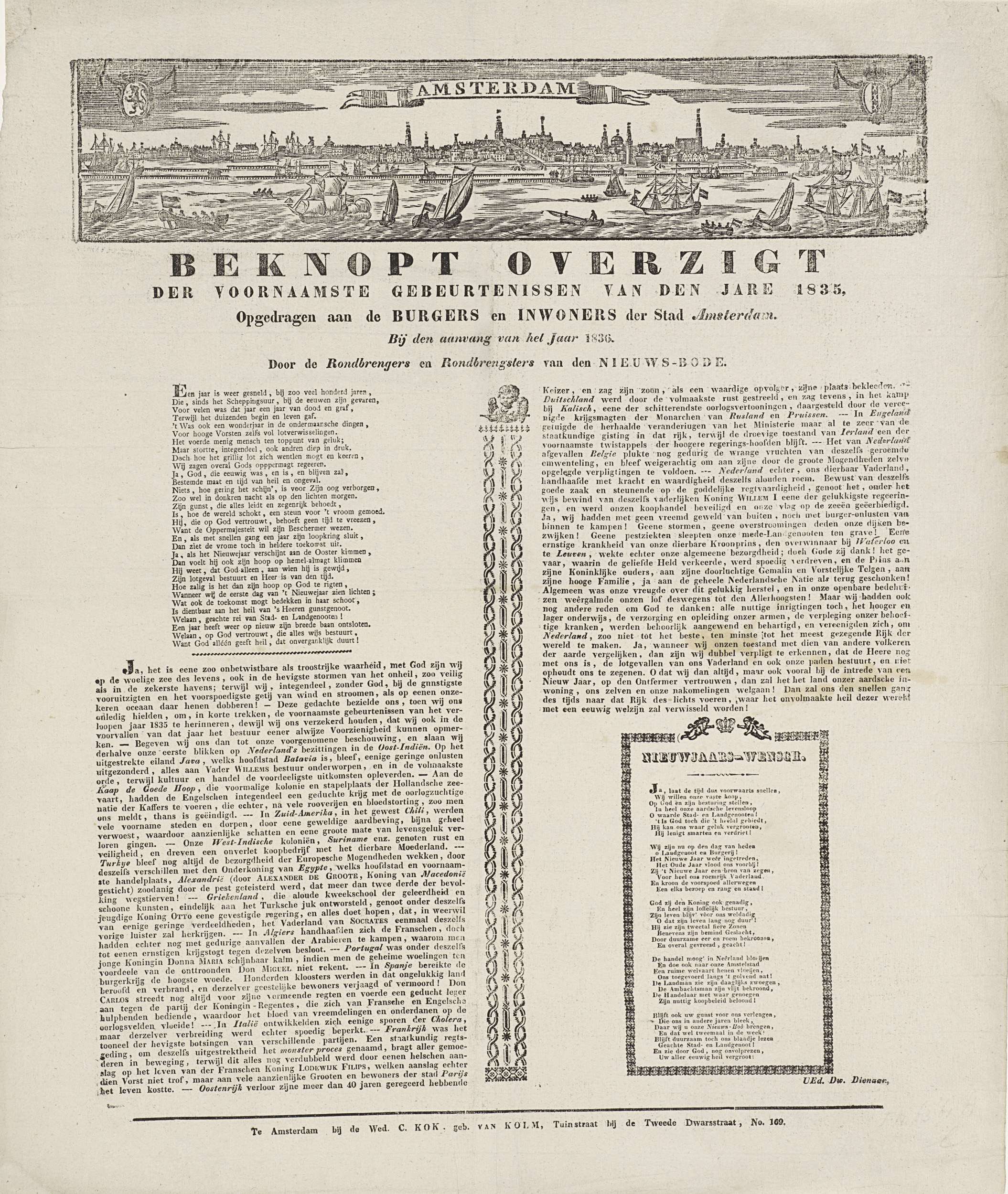 Nieuwjaarswens namens de ombrengers van couranten (krantenbezorgers) te Amsterdam voor het jaar 1836. Bovenaan een gezicht op Amsterdam vanaf het IJ. Onderaan in twee kolommen het nieuws van het afgelopen jaar en twee verzen.