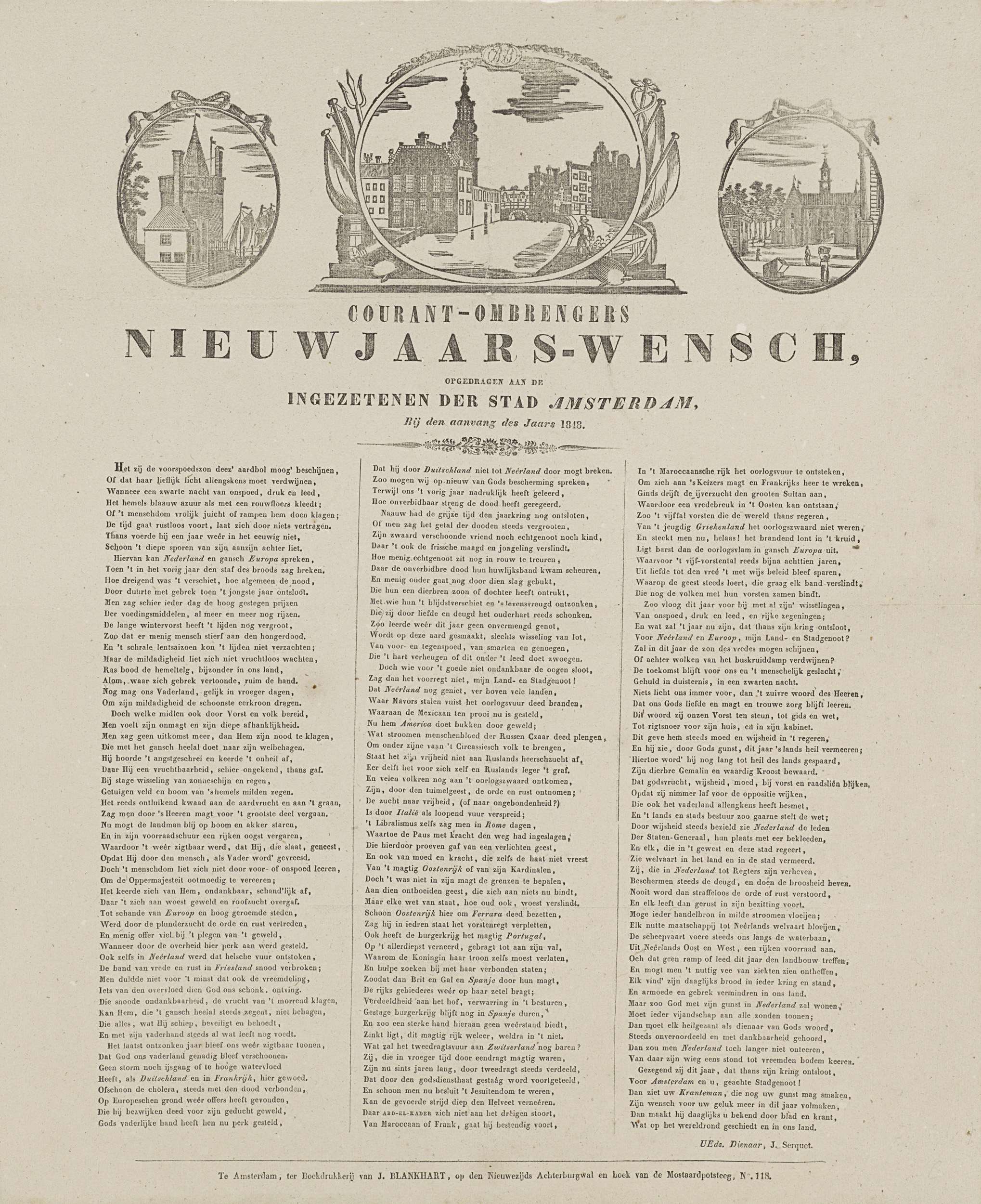 Nieuwjaarswens namens de ombrengers van couranten (krantenbezorgers) te Amsterdam voor het jaar 18478 Bovenaan drie medaillons met centraal een gezicht op het Singel bij de Munt met op de kade een krantenbezorger, links de Schreierstoren, rechts de Leidsepoort. Onderaan een gedicht in drie kolommen. Van de courantombrenger: J. Serquet.
