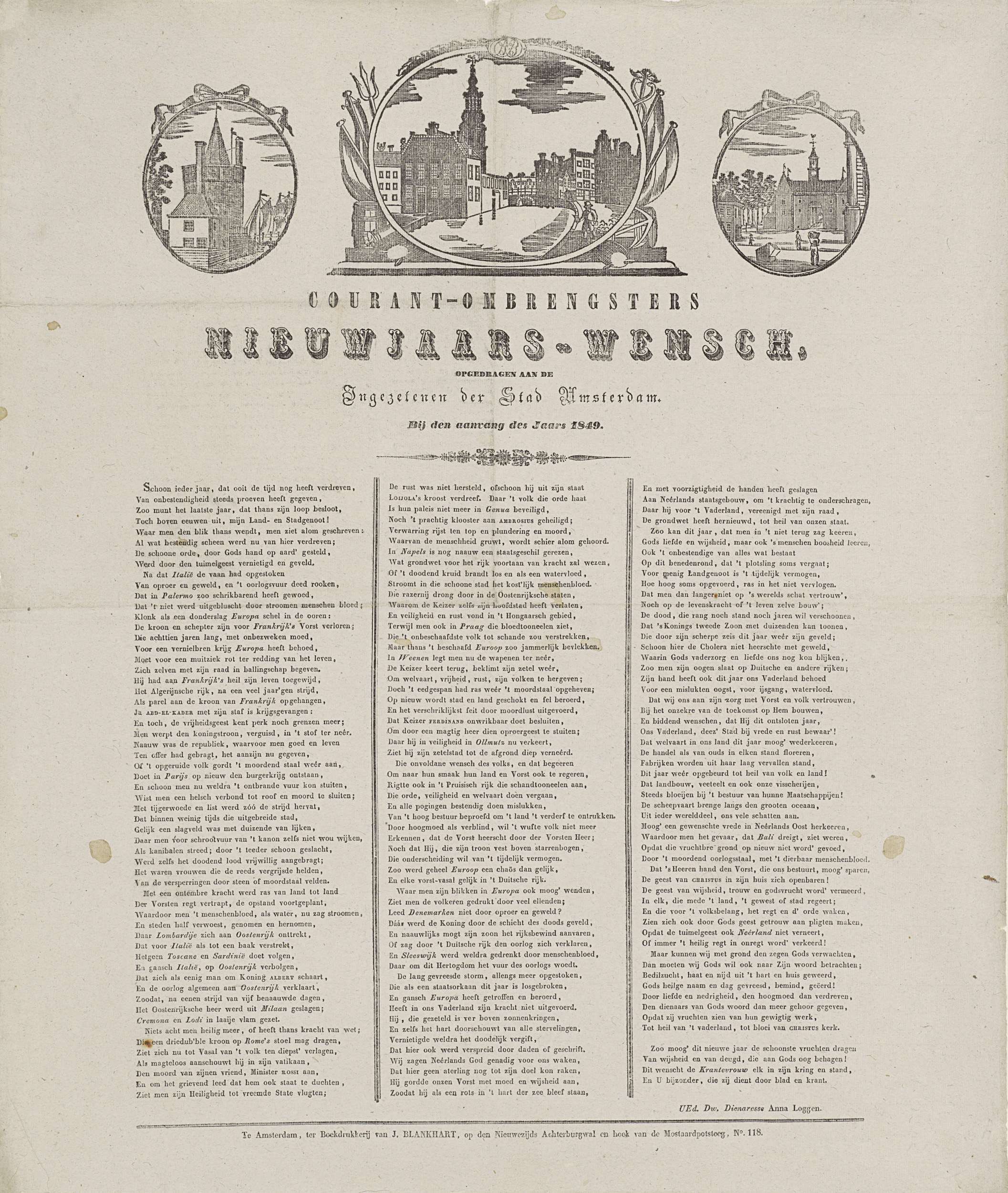 Nieuwjaarswens namens de ombrengers van couranten (krantenbezorgers) te Amsterdam voor het jaar 1849. Bovenaan drie medaillons met centraal een gezicht op het Singel bij de Munt met op de kade een krantenbezorger, links de Schreierstoren, rechts de Leidsepoort. Onderaan een gedicht in drie kolommen. Van de courantombrengster: Anna Loggen.