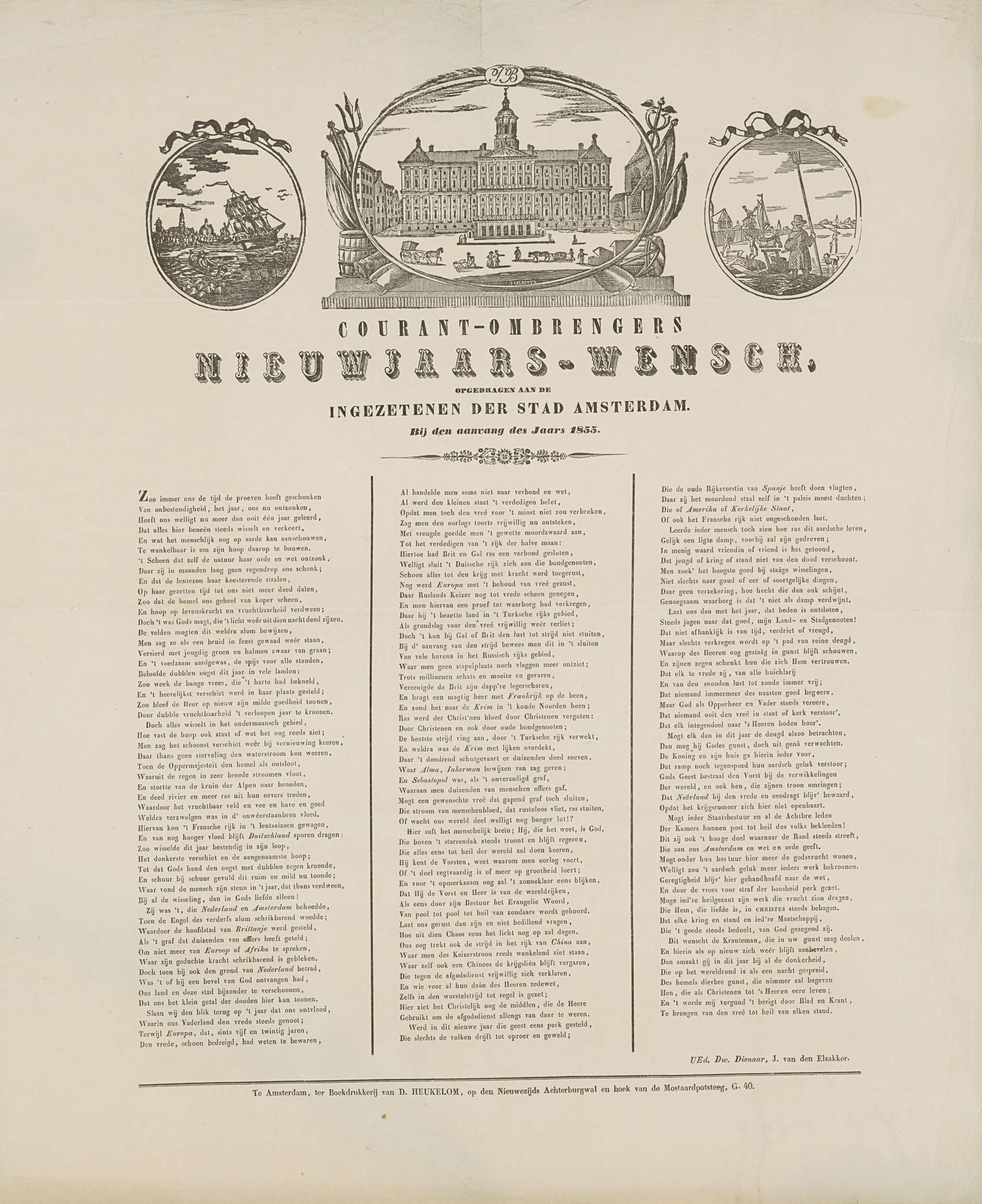 Nieuwjaarswens namens de ombrengers van couranten (krantenbezorgers) te Amsterdam voor het jaar 1855. Bovenaan drie medaillons met centraal een gezicht op het Paleis op de Dam, links een schip op het IJ, rechts ijsvermaak buiten de stadswal. Onderaan een gedicht in drie kolommen. Van de courantombrenger: J. van den Elsakker.