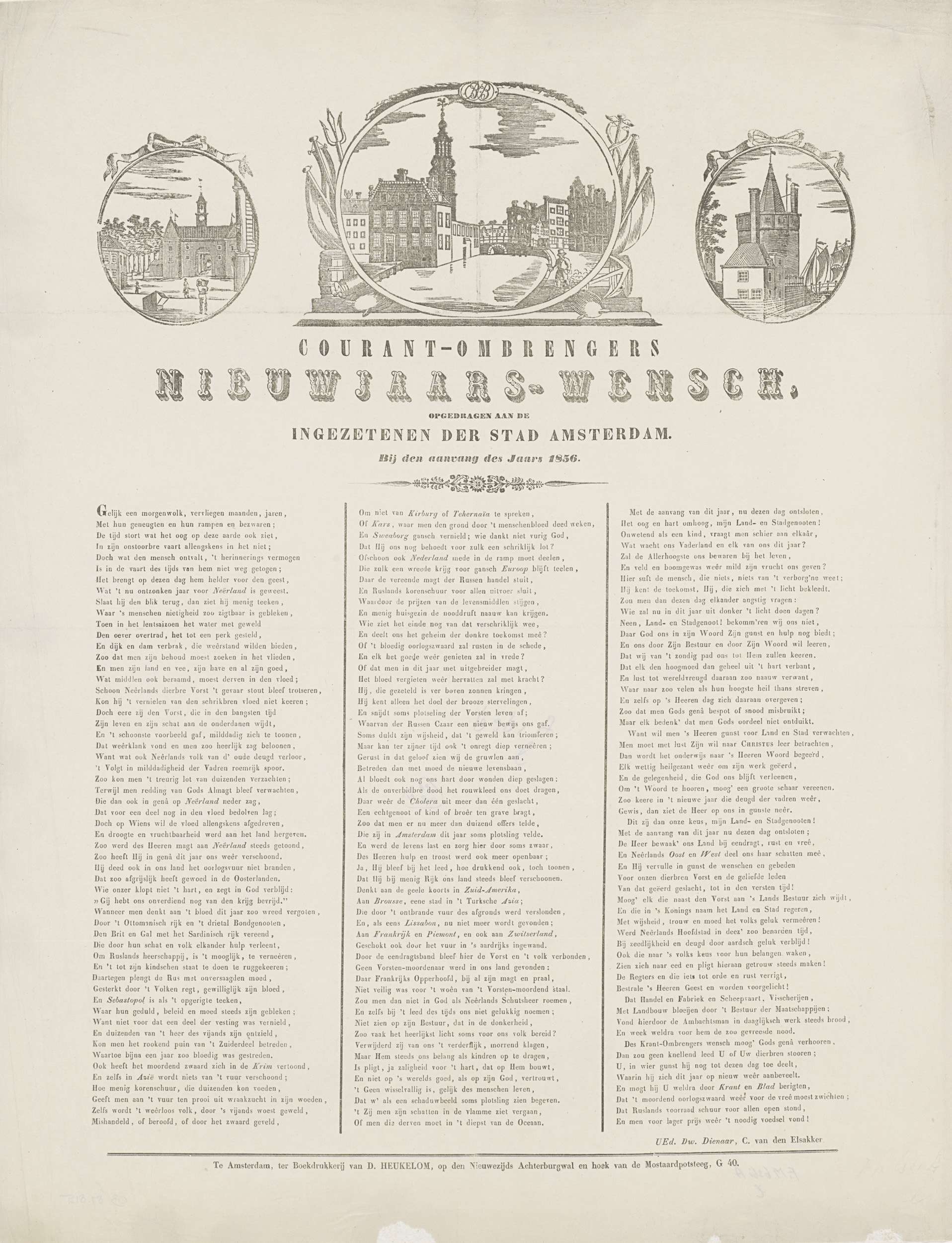 Nieuwjaarswens namens de ombrengers van couranten (krantenbezorgers) te Amsterdam voor het jaar 1856. Bovenaan drie medaillons met centraal een gezicht op het Singel bij de Munt met op de kade een krantenbezorger, links de Leidsepoort, rechts de Schreierstoren. Onderaan een gedicht in drie kolommen. Van de courantombrenger: C. van den Elsakker.