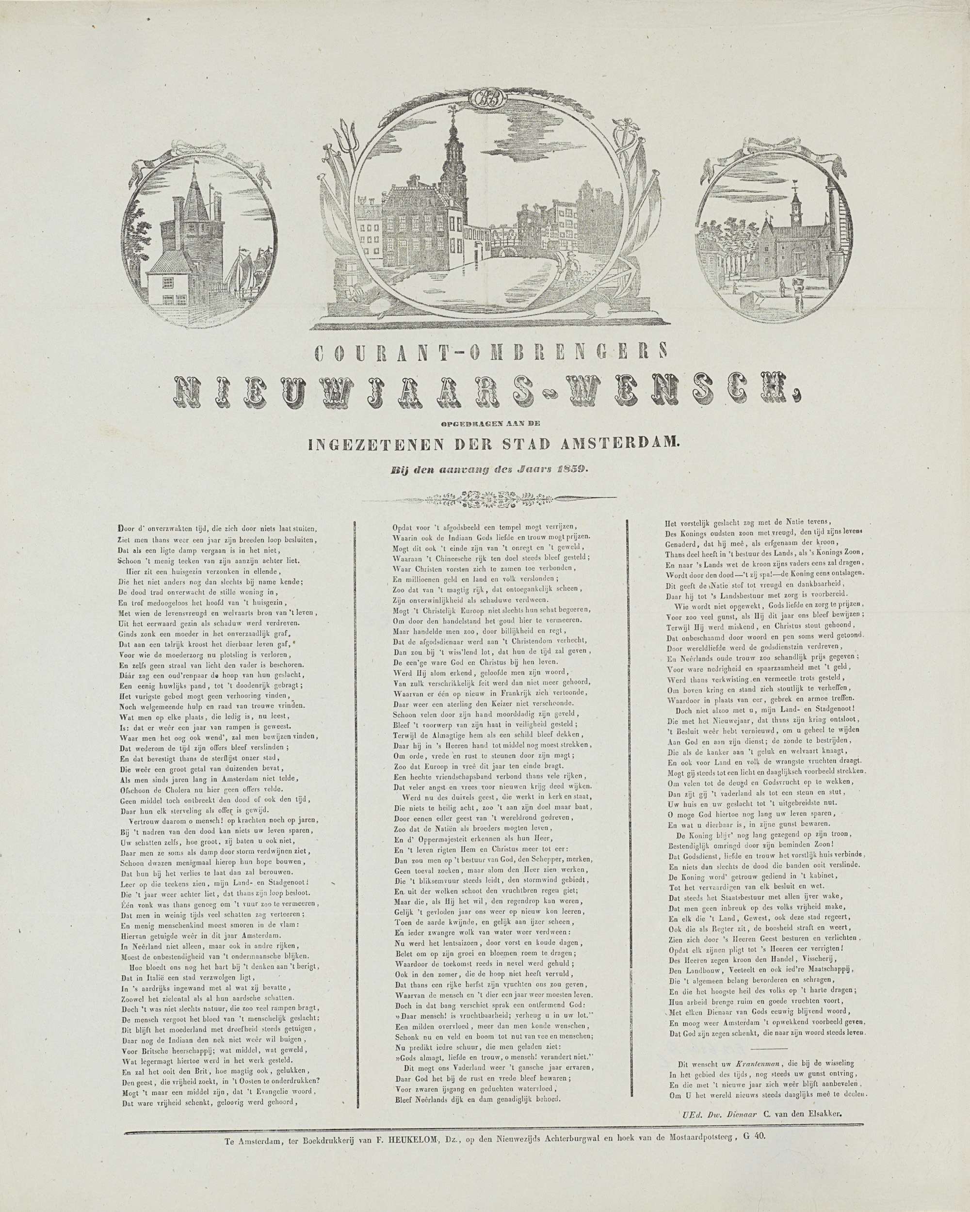 Nieuwjaarswens namens de ombrengers van couranten (krantenbezorgers) te Amsterdam voor het jaar 1859. Bovenaan drie medaillons met centraal een gezicht op het Singel bij de Munt met op de kade een krantenbezorger, links de Schreierstoren, rechts de Leidsepoort. Onderaan een gedicht in drie kolommen. Van de courantombrenger: C. van den Elsakker.