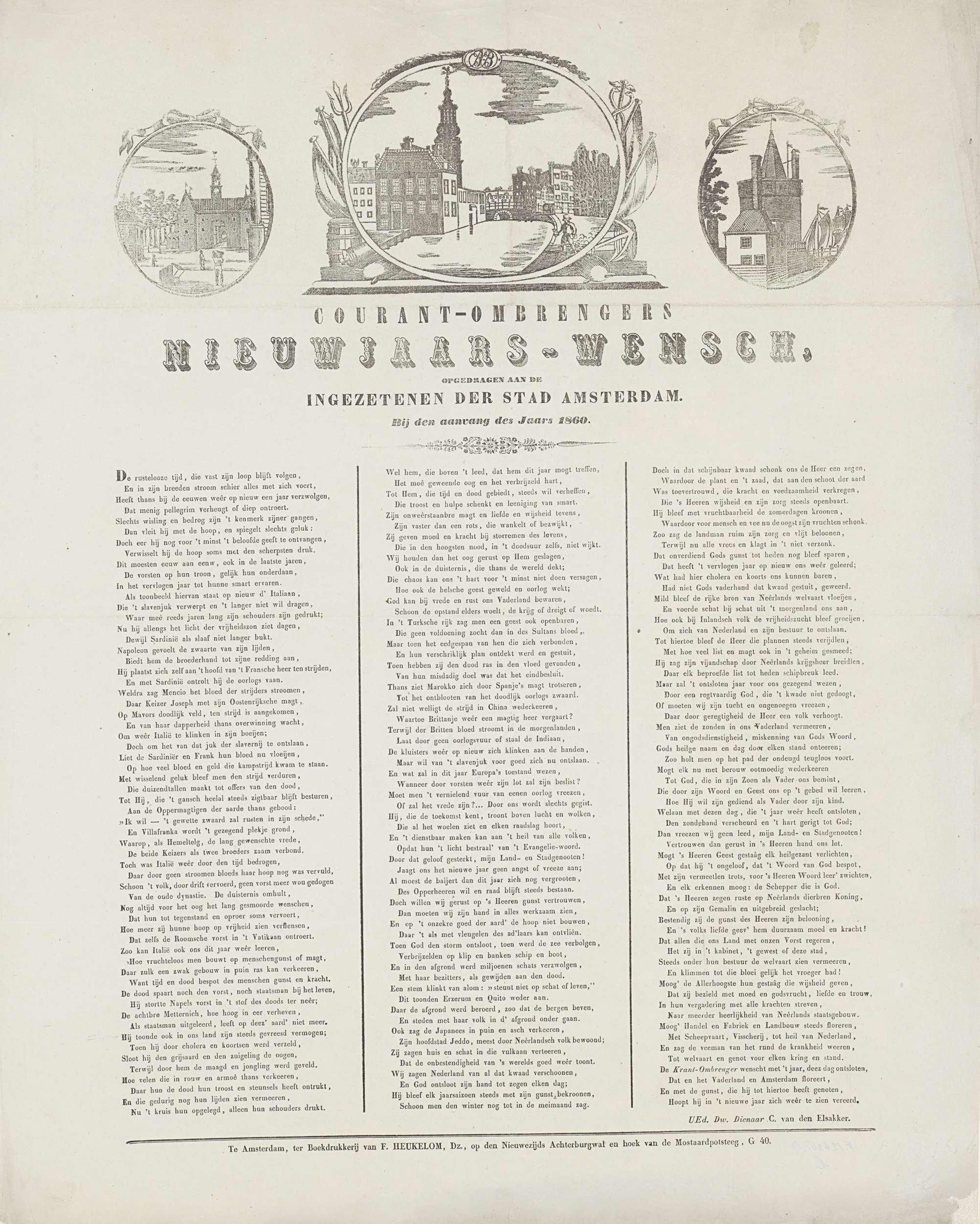 Nieuwjaarswens namens de ombrengers van couranten (krantenbezorgers) te Amsterdam voor het jaar 1860. Bovenaan drie medaillons met centraal een gezicht op het Singel bij de Munt met op de kade een krantenbezorger, links de Leidsepoort, rechts de Schreierstoren. Onderaan een gedicht in drie kolommen. Van de courantombrenger: C. van den Elsakker.