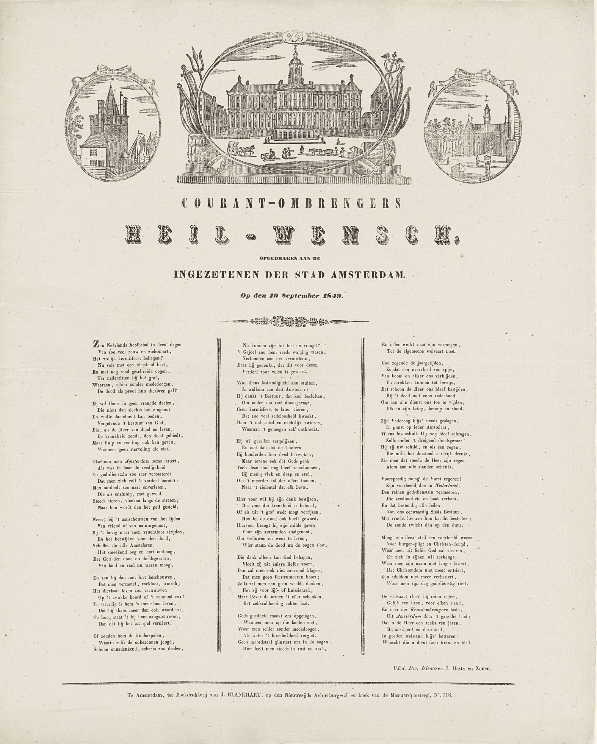 Kermisprent namens de ombrengers van couranten (krantenbezorgers) te Amsterdam, 10 september 1849. Bovenaan drie medaillons met centraal een gezicht op het Paleis op de Dam, links de Schreierstoren, rechts de Leidsepoort. Onderaan een gedicht in drie kolommen. Van de courantombrengers: J. Hesta en Zonen.