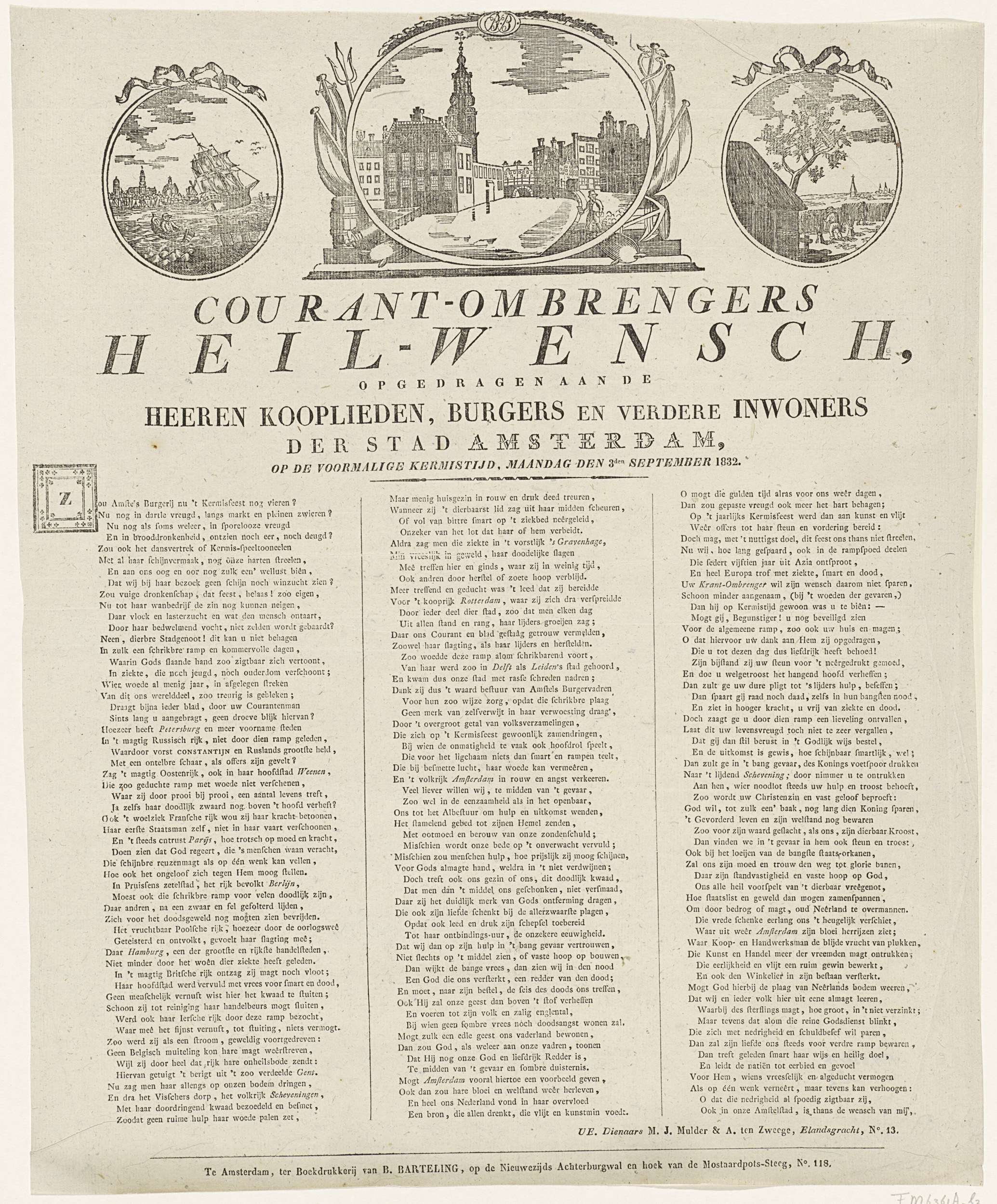 Kermisprent namens de ombrengers van couranten (krantenbezorgers) te Amsterdam, 3 september 1832. Bovenaan drie medaillons met centraal een gezicht op het Singel bij de Munt met op de kade een krantenbezorger, links een zeil schip op het IJ, rechts een boer die graan oogst. Onderaan een gedicht in drie kolommen. Van de courantombrengers: M.J. Mulder ...