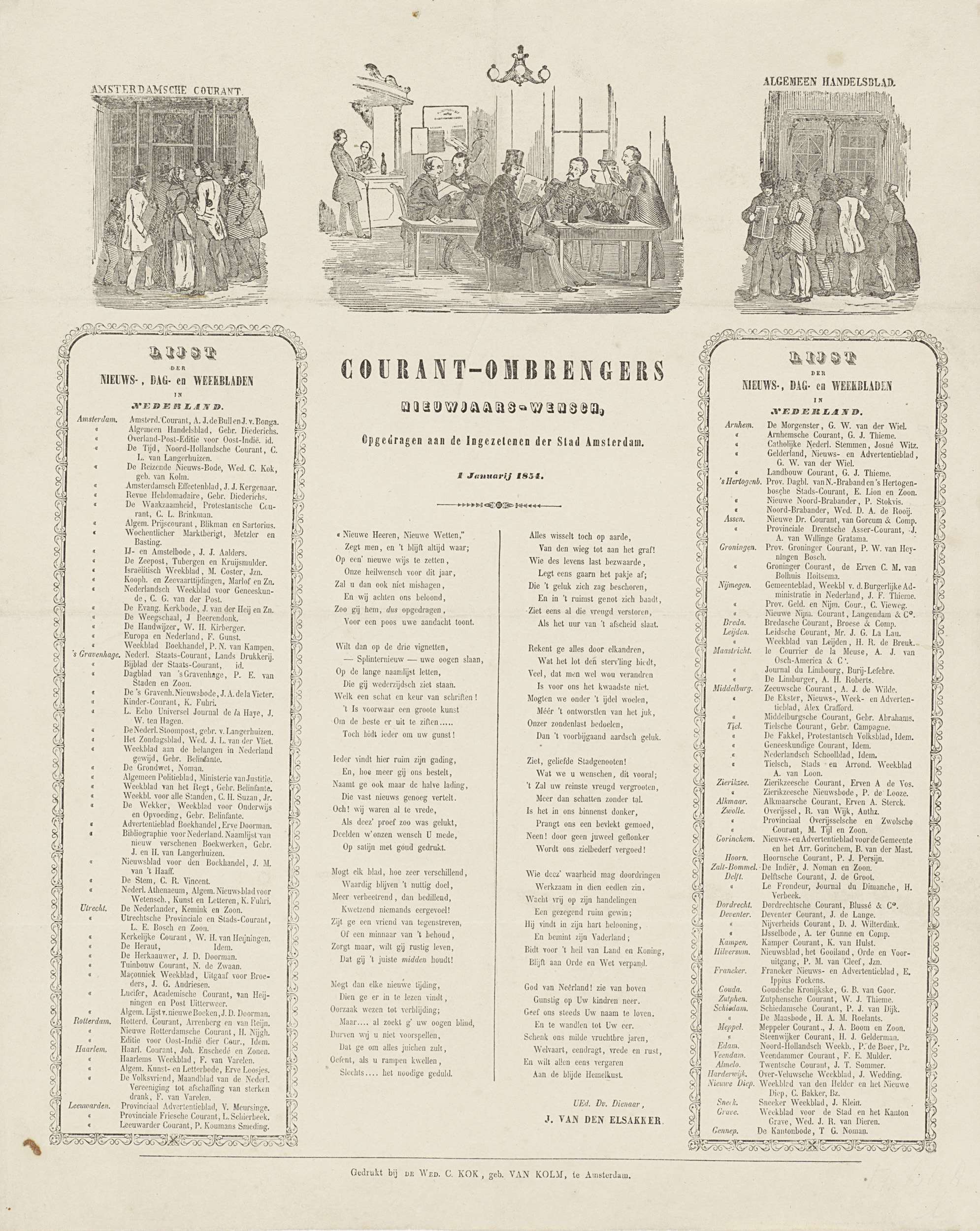 Nieuwjaarswens namens de ombrengers van couranten (krantenbezorgers) te Amsterdam voor het jaar 1854. Bovenaan drie vignetten met centraal het interieur van een sociëteit met heren die kranten lezen, links het bureau van de Amsterdamsche Courant, rechts het bureau van het Algemeen Handelsblad. Onderaan een gedicht in twee kolommen met aan weerszijden lijsten van de nieuws-, ...