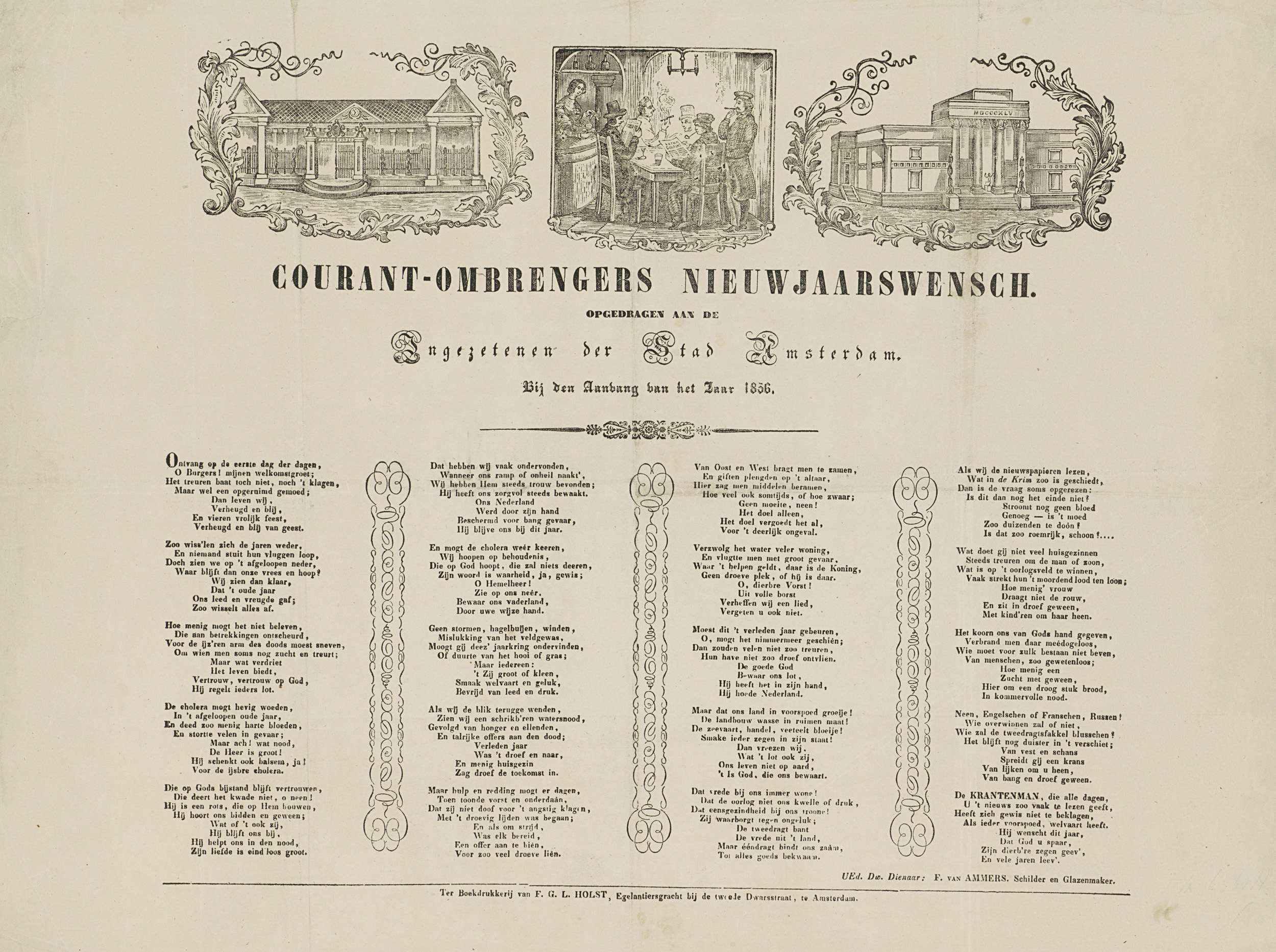 Nieuwjaarswens namens de ombrengers van couranten (krantenbezorgers) te Amsterdam voor het jaar 1856. Bovenaan drie vignetten met centraal het interieur van een koffiehuis of sociëteit met heren die kranten lezen, links de Korenbeurs op het Damrak, rechts de beurs van Zocher. Onderaan een gedicht in vier kolommen. Van de courantombrenger: F. van Ammers, schilder en ...